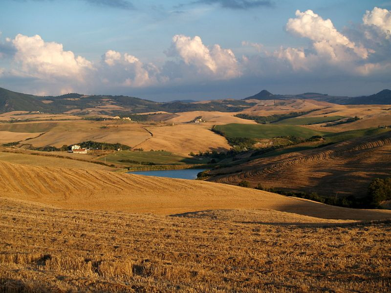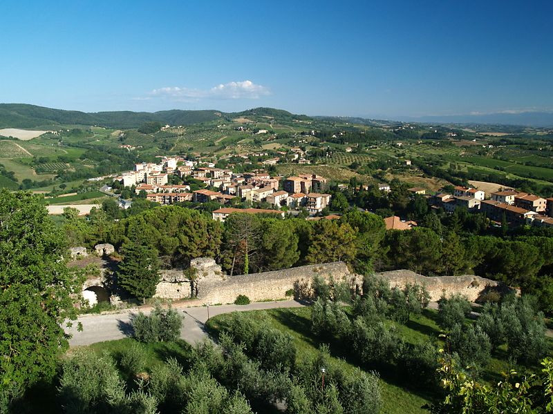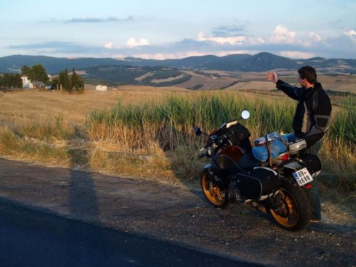 Den zase ubíhá o něco rychleji než bylo v plánu, pročež se snažíme něco nahnat dálniční zkratkou na Livorno. Za odbočkou do vnitrozemí začíná Toskánsko v tom smyslu, jak si ho budu na věky pamatovat. Zapadlá silnička, přitom široká na tři auta, drobné kopečky nejprve zatravněné či plné ovocných sadů, později oseté povětšinou obilím, na jejich vrcholcích občas z kamenů zděný domeček s červenou střechou a několika stromy kolem. Vyjímečně je na rozlehlejším vrcholku celá vesnička. Tankujeme u zapadlé pumpy v jednom z mála městeček a míříme dál na východ. Za zády nám pomalu zapadá slunce. Užíváme si hodiny úžasné silnice se zatáčkami přesně zaoblenými pro motorkáře. Slunce už se dotýká obzoru, když objevujeme nezaměnitelnou siluetu San Gimignana.