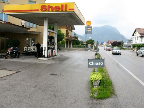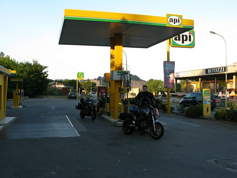 Od zelináře jakoby se všechno zlomilo. Cesta se klikatí a další dvě hodiny jedeme z jedné zatáčky do druhé, doplněné maximálně o desetimetrové rovinky. V převodovce 1, 2, 3, kolem skály a před námi svítící kontrolky benzínu. Cesta se leckdy omezovala na asfalt šířky jednoho vozidla táhnoucí se po boku hory a nabízející daleké výhledy do kraje. Na výpary dojíždíme k italské klasice s cedulí "Aperto" - což znamená automatickou pumpu, tedy "Samoobsluhu". Za předplacených 50 bereme společně absolutně po hrdla, ale ani kapka na zmar.