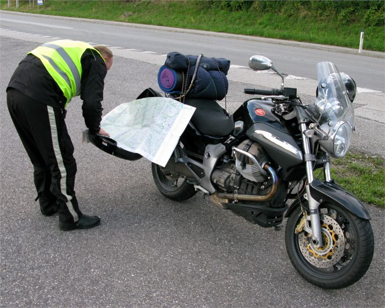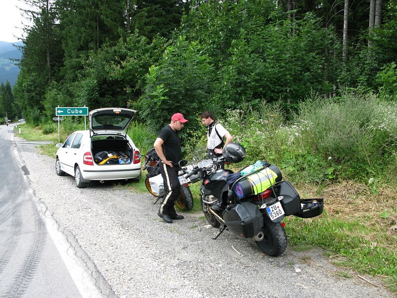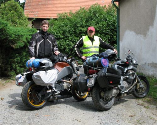 . Cestou jsme však zažili i jednu havárii! Na úzké zatáčkovité silničce jsem přibrzdil, téměř stojíc sjel na štěrkovité odpočívadlo a automaticky hledajíc stojánek jsem si všiml zprava se hrnoucích pár metráků železa a Tomáše, jehož byť ABSem vybavený stroj se k mému blížil jak sáňky. V tuto chvíli, když jste všichni patřičně napjati, hodí se celou věc vysvětlit. O pár zatáček dříve se mezi nás dostalo vozidlo Mercedes, které se Tomáš jal zrovna předjíždět, když si všiml mého záměru zastavit. I stočil svůj rozjetý stroj rovnou na štěrkovité podloží mimo silnici a počal brzdit. Čímž se dostáváme zpátky do adrenalinem napěchované situace! Vytřeštěné pohledy na obou stranách a ťuk. Jelikož k dobrždění sáněk od bloku mého motoru chybělo tak pět centimetrů, nestalo se vůbec nic. Překvapeně koukám, jak se Tomáš marně snaží srovnat plně naložený "autobus" do vzpřímené polohy, aby si při potenciálním kontaktu se zemí nerozkřápl nový kufřík. Ještě že jsem se včas vzpamatoval a celé věci jsme se předlouze smáli...