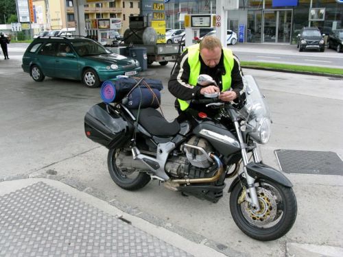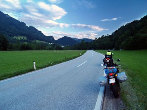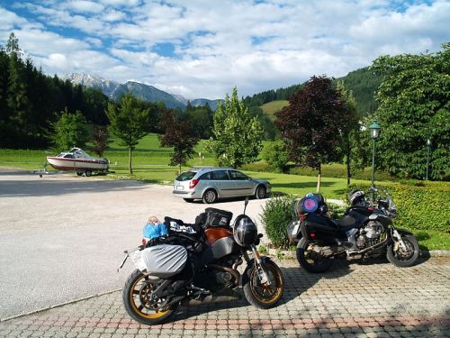 Dle chytré krabičky Garmin až na drobné objížďky a rozkopané mosty sledujeme původní trasu po severním Rakousku. Až k večeru se na úrovni památné obce Klaus ukazují první kilometry suché silnice a prvni rozmrzení nad maximální povolenou stovkou. Předalpské zatáčky rozhodně lákají k rychlejším výjezdům, zvlášť když trpíte začínajícím nadšením z dobývání Alp. Počalo se ztmívat, načež se ukázalo jako zcela zcestné moje předchozí tvrzení, že "v Rakousku je každej druhej barák penzion". Po zcela marných průjezdech tří opuštěných vesniček nacházíme po deváté hodině ubytování kdesi v pustině na půli cesty z Klausu do Liezenu. "Draze" vypadající penzionek mohu doporučit případným následovníkům.