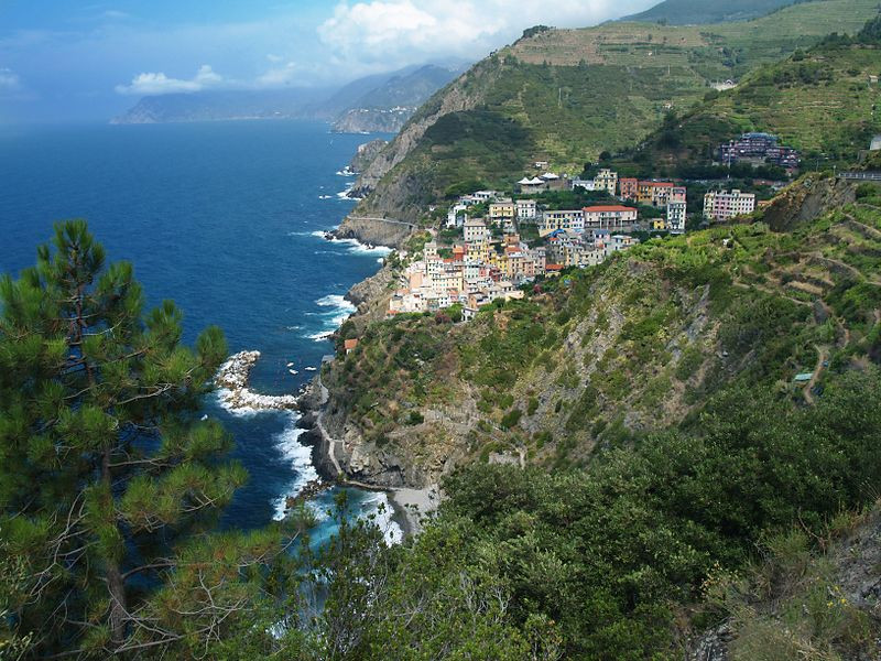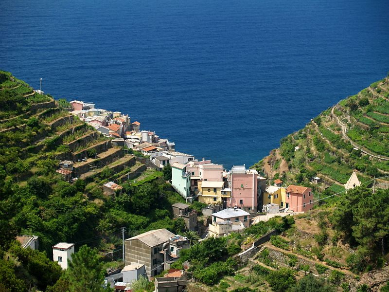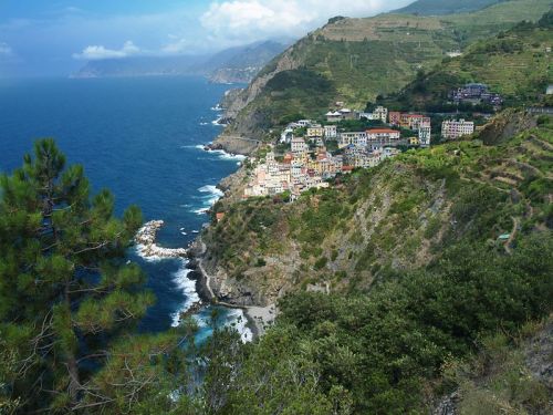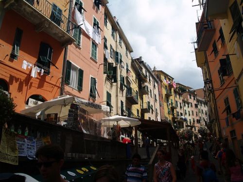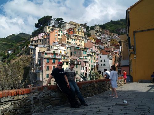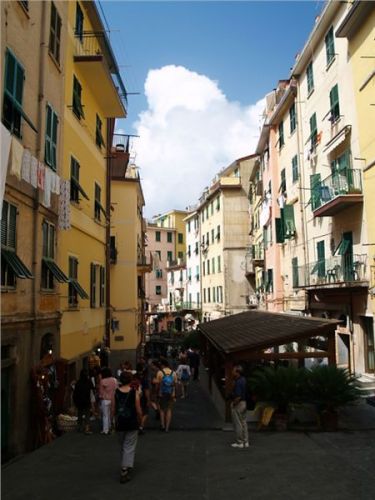 Míříme na pobřeží do druhé z Cinque Terre - Riomaggiore. Spousta malých barevných baráčků nalepených na první pohled nesmyslně na skalisku, těsně u vody. Dav turistů míří ze štrůdlu aut kolem příjezdové silnice pěšky do vesnice. Vjezd je samozřejmě pouze pro výjimky a čím menší vozidlo, tím lépe. Nejlepším náklaďákem je tu dvoutaktní tříkolka s kabinkou pro jednoho, ale i sanitní dodávka se tu protáhne obloukem tunelu opticky minimálně o třetinu menším než je sama. Nakoupit můžete ve všudypřítomném krámku Coop a i místní zelináři / ovocnáři mají dokonce levnější zboží, než včerejší strejda v dodávce (banánový index - 0,4 vs. 0,5 E). Kdo ví, zda tohle místo žilo opravdu kdysi pouze z rybolovu, dneska to spíš vypadá, že malované baráčky se zelenými okenicemi tu postavil někdo s velkým podnikatelským duchem. Už jen ta klasická fotka je úžasný turistický tahák. Určitě se tady můžete taky ubytovat nebo si dát dobrou kávu. A jinak tu vlastně není nic.