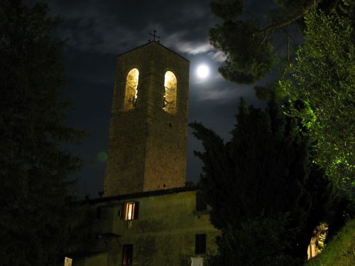 Ještě nám doporučila nedalekou Trattoria Chiribiri a Fiátek zase zmizel někde za rohem. V restauraci, která původně zavírala v jedenáct, nás hostili ještě asi dvě hodiny. Vínko, lazaně, káva, dezertík, všechno vynikající. Anglicky mluvící číšník přidal ke všemu kus historky, mimo jiné o návštěvě Prahy. Pak už vypadal přecejen ospale, pročež jsme se vydali zpátky. Tomáš spát a já pro foťák. Další hodinu jsem se potloukal liduprázdnými uličkami úžasného města, shlížel z věže na světýlka v krajině a fotil osvětlené věže. Když v půl druhé uléhám, uvažuji, zda motorky budou na svém místě i ráno. Obhlížející carabinieri jsem ve městě potkal aspoň třikrát, tak snad...
