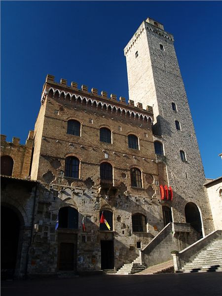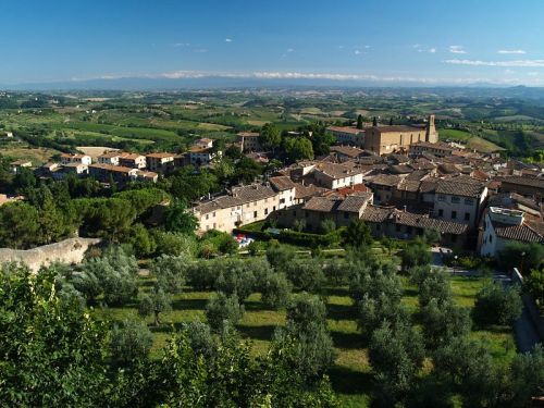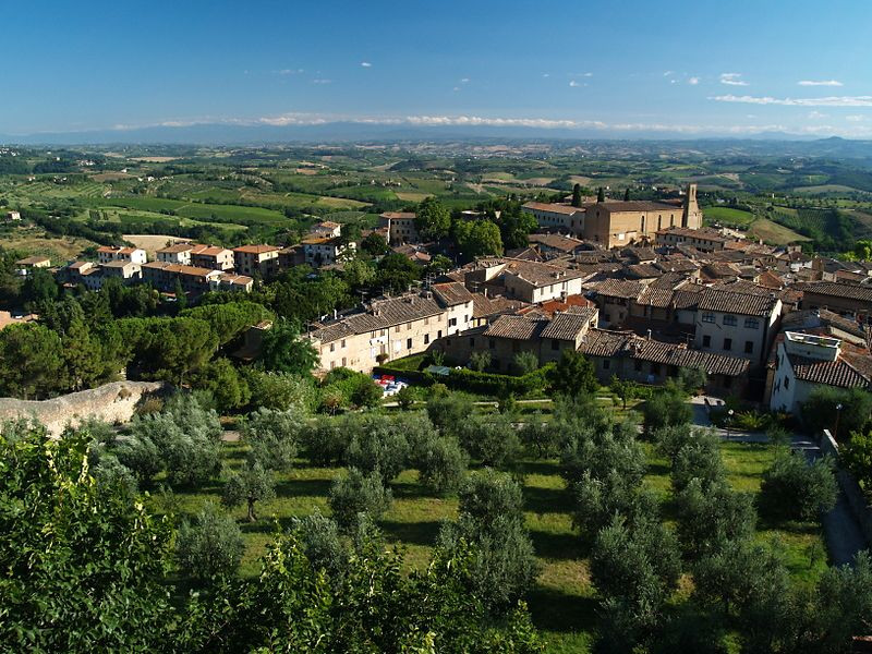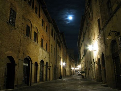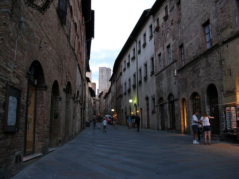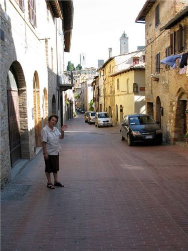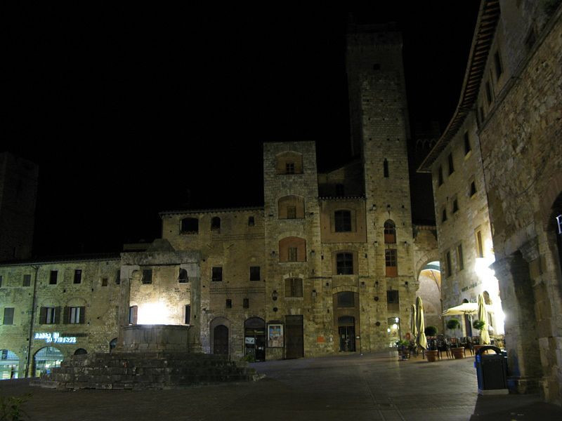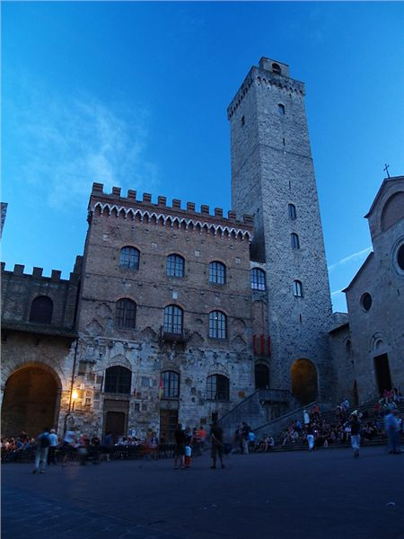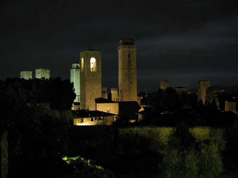 Sam Gimignano je město na první pohled zapomenuté kdesi (kdysi) ve středověku. Kamenné domy uzavřené za hradbami vypadají dnes patrně stejně jako před stovkami let, přesto město žije moderním životem. Spousta restaurací a elegantních kavárniček je umně skryta, že nebýt stolečků k posezení venku, téměř si jich nevšimnete. Nikde tu není na stěnu přilepená ani bílá bedna klimatizace, všechno je schováno v mrňavých oknech a výklencích, zakryté tmavou mřížkou. Město je však známé hlavně svými třinácti věžemi, které vystavěny z kamenů, vydržely do dneška. Jedna z nich je volně přístupná a z vrcholku se nabízí pohled na část města na jedné straně a dalekou krajinu nořící se do tmy na straně druhé. Atmosféru místa dokonale dokresluje orchestr koncertem zadumané hudby. Náměstíčko je nacpané publikem až po protější schody. Tohle místo má styl a nebýt tu s Tomášem, je to kus romantiky