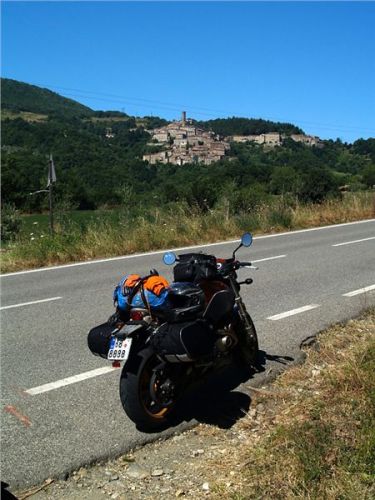 Cesta Toskánskem je i nadále geniální a pro motorkáře vysněná. V cílovém městě jsme vystoupali až na vrchol místního hradu. Odsud je úžasný rohled přes střechy města do dalekého kraje. Což je také podle plánu všechno. Cesta k jezeru Bolsena je opět samá zatáčka, roviny jsou tady zcela vyjímečné, pročež mít teď obuté sandardní Dunlopy D208, tak se tu za den zničí.