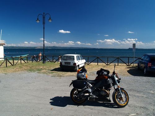 Na stroje usedáme časně z rána, vědomi si dalších sedmi set kilometrů před námi. Pobřeží se líně probouzí k životu, pohyb lidí i vozidel je ještě minimální. Kroužíme po obchvatu kolem Říma a padesátku na sever upalujeme po dálnici. Pak už sjíždíme na silnici "toskánského stylu" a opět zatáčkovitou silničkou pokračujeme na Lago Trasimeno. S chutí na rybku obědváme v pobřežní restauraci menu za krásných 60 E, probíráme zážitky, krmíme kolem ťapkající kachny a racky.