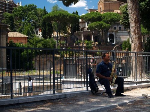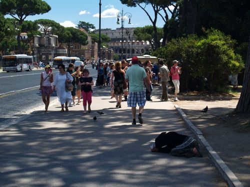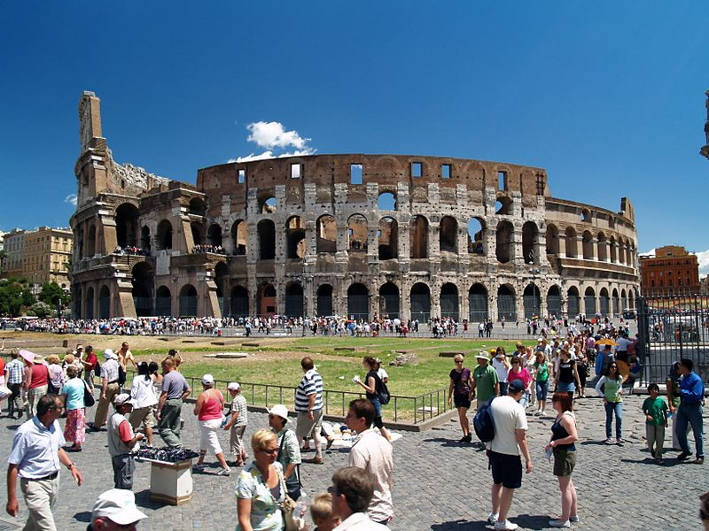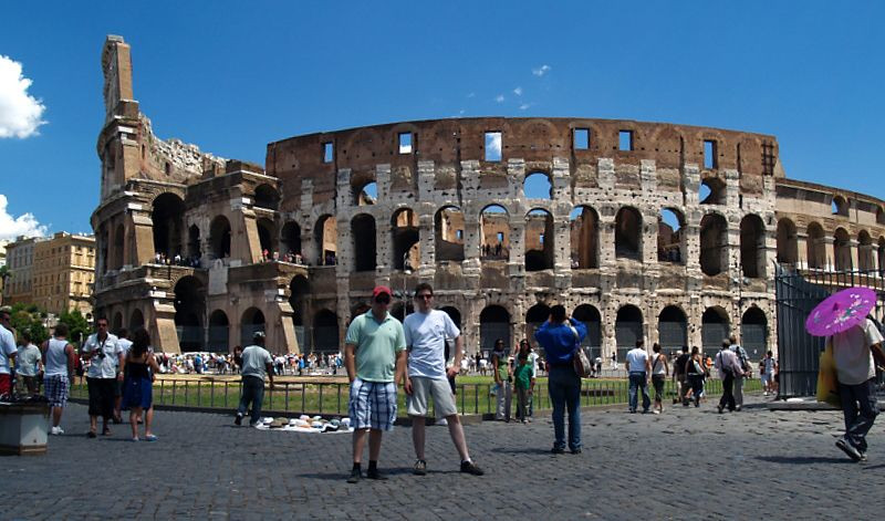 Pěšky procházíme poněkud zmatenou trasu k památníku Viktora Emanuela (pochopitelně je na něm lešení), kolem Foro Romano (kterým lze projít pochopitelně výhradně v opačném směru) ke Koloseu. Takhle na živo je vskutku velké a obdivované mrakem lidí. Od vstupu jednoznačně odradí nekonečná fronta. Fast food oběd ve vestibulu metra a bloudíme směrem k fontáně Di Trevi. Fontána je obsypána trsem turistů a nepřetržitě hlídaná několika policajty, kteří každou chvíli rozezní své píšťalky, když se jim cokoli nezdá.