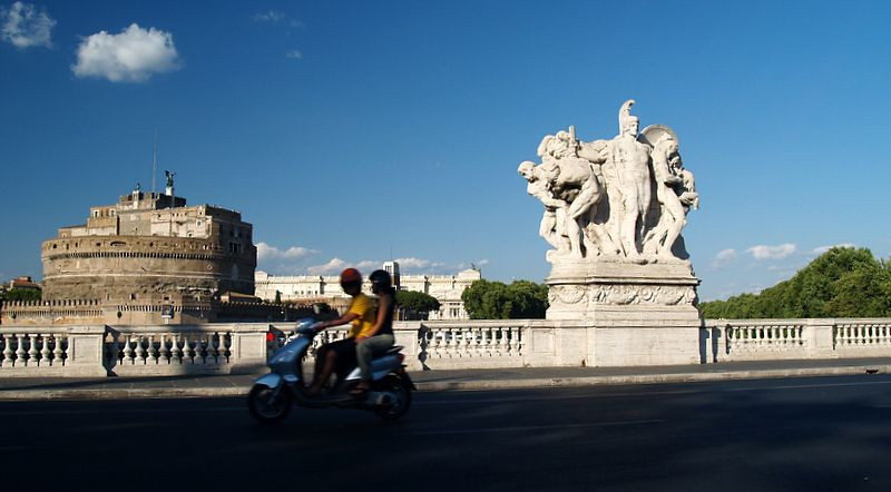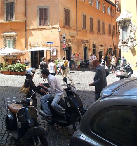 Italský dopravní poznatek: V Římě musíte mít skůtr. Je to nejrychlejší dopravní prostředek vůbec. Nepoužívají se tu kola nebo normální motorky. Respektive, jejich poměr vůči skůtrům je asi 1000 : 1. Kdo chce motorku, koupí si velký, ba obrovský skůtr, na kterém by se dalo cestovat přes celou zemi. Na skůtru se jezdí v šortkách, šatech, saku, s telefonem v ruce, s cigaretou, ale vždy s helmou a pokud možno slunečními brýlemi typu dle vzoru amerických letců z Top Gunu. Pokud padne na semaforu zelená, vyrazí nejdřív vlna skůtrů, co se mezitím prodrali do první pozice pod semafor. Obecně se zejména mimo město jezdí způsobem, který ve finále zpomaluje všechny. První auto čeká na červené, dokud řidič nenabyde dojmu, že každou chvíli už bude zelená a najede až za semafor do křižovatky. Poté čeká, až se na něj začne zezadu další lepit a může tedy jet.