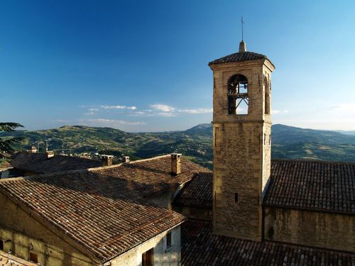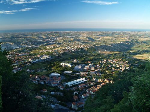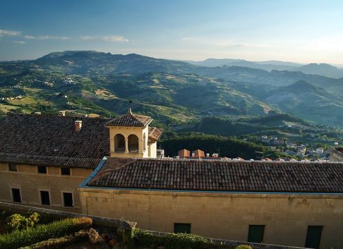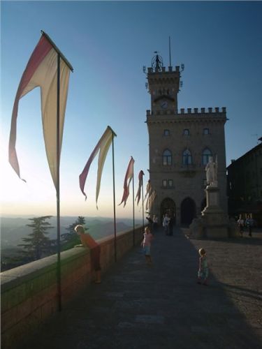 Netušil jsem, že San Marino je město postavené na vrcholku skal, ale díky Tomášově improvizované navigaci nakonec šplháme serpentýnami až na konečnou - k zákazu vjezdu do historické zástavby. Když už jsme tu, pěšky dobydeme vrchol. Na všechny strany se otevřely výhledy na rozlehlé kraje. Tolik prostoru, jako odsud, jsem snad ještě neviděl. Na jedné straně za spoustou baráčků moře až na obzor, na straně druhé pak fotogenická kostelní věž, hornatá krajina a západ slunce...