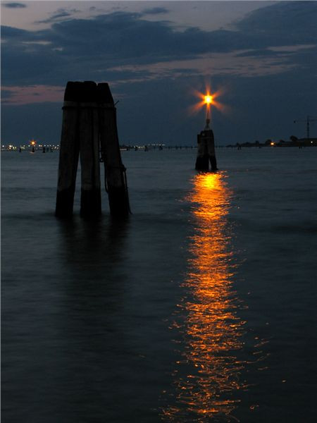 Podél Canal Grande projdeme až k Ponte Rialto - slavnému to mostu s dvěma řadamy obchůdků, který ovšem než jakkoli slavnostně působí jako vietnamská tržnice s nesmysly. Podobným zklamáním je i San Marco. Všechno se tu opravuje, a tak se na nás z rozsáhlého lešení zubí pán s moc pěknými, asi desetimetrovými hodinkami. Na fotky nic moc. Usedáme na břehu a za zapadajícího slunce pořizuji sérii minimalistických snímků "voda a klacky" (TomášTM). Uličkami se postupně prodereme na druhou stranu hlavní části města a pak už se paní v Gárminu necháme vést nejkratší cestou zpátky na bus.