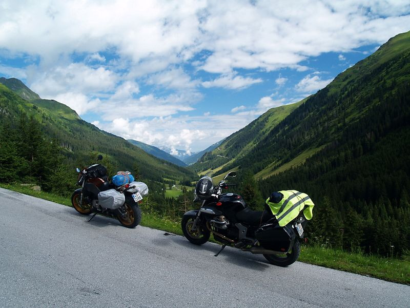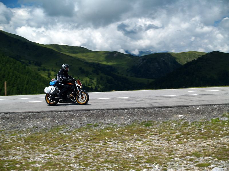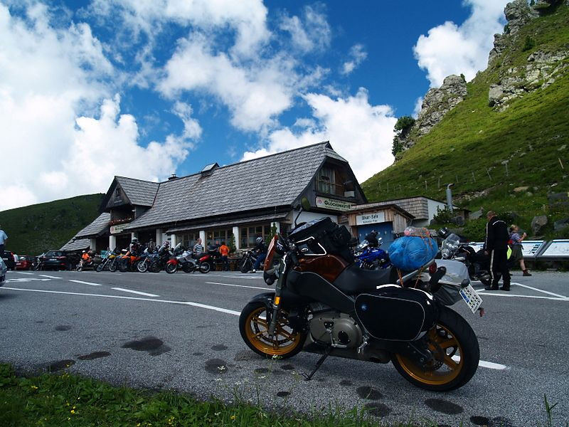 Když je u silnice cedule žádající motorkáře o pomalou jízdu, je jasné, že silnička bude mít smysl. Takovými tedy přejíždíme Turrachen Höhe. U zdejšího jezera je překvapivě živo. Silnici si užívá spousta motorkářů a z kopce to kolem nás pálí s úžasnou lehkostí patrně místní frajeři na GéeSech bez kufrů. K průjezdu po jediné námi placené odbočce Nockalmstrasse dostáváme památeční nálepku, kterou je okamžitě zkrášlen plexištítek Brevy. Pár dní ještě potrvá, než je Tomáš upozorněn, že je nalepena ve špatném úhlu. Jak jsou někde číslované zatáčky, jste už hodně na horách. Silnička sice placená, ale vpravdě geniální. Stačí se ohlédnout a pod sebou vidíte asfaltového hada, který kouzlí ten přihlouple nadšený úsměv na tváři. A jakmile skončí, zaskočte na biker menu a kávičku do restaurace pod dálničním mostem.