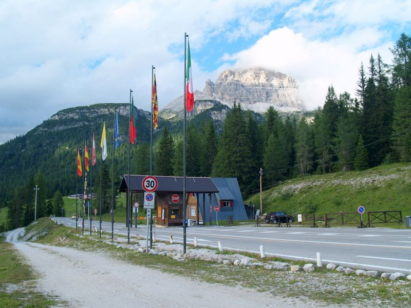 S protahujícími se stíny víceméně pouze míjíme skalní útvar Tre Cime Di Lavaredo s placeným vjezdem. Trasa pochopitelně nemohla vynechat ani všemi motocestopisy zachycovanou Cortinu D"Ampezzo. Na úzké silničce kdesi mezi skalami zastavujeme před úzkým mostem a červenou na semaforu. Rozhled kolem nabízí pouze stromy na jedné, zmíněná skaliska na druhé straně, zlověstné mračno válící se přes jejich vrchol a spoustu kamení. Je večer a nabývám neodbytného pocitu ztracenosti v divočině. V teoretické rovině řešíme co tady, pokud by některý ze strojů škytnul naposledy.