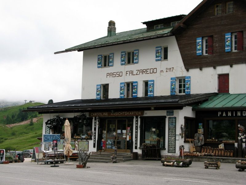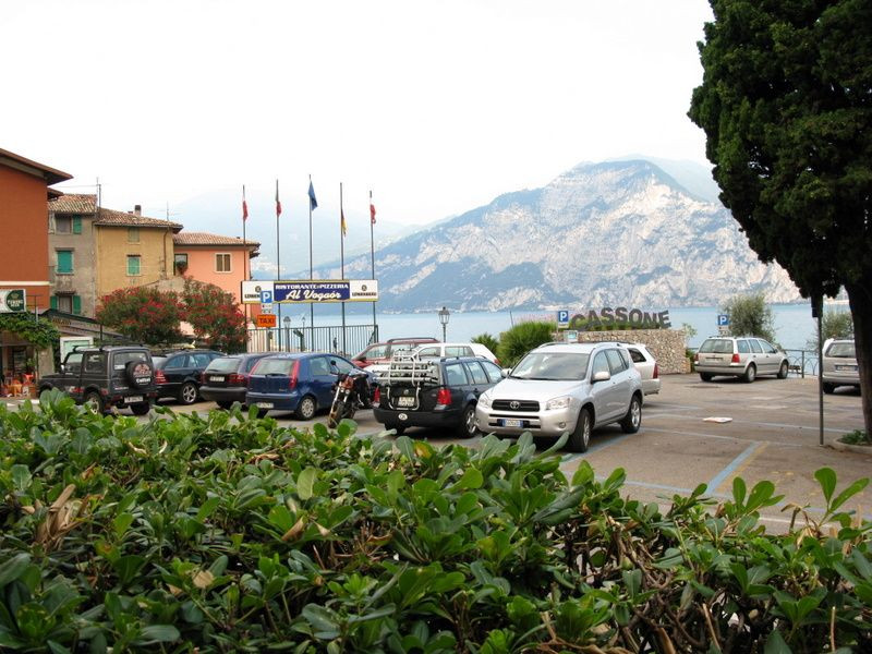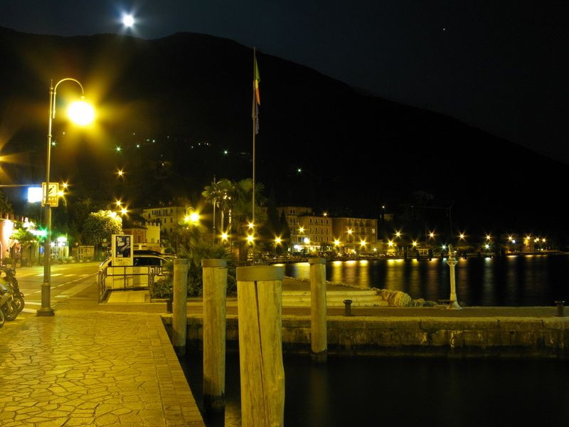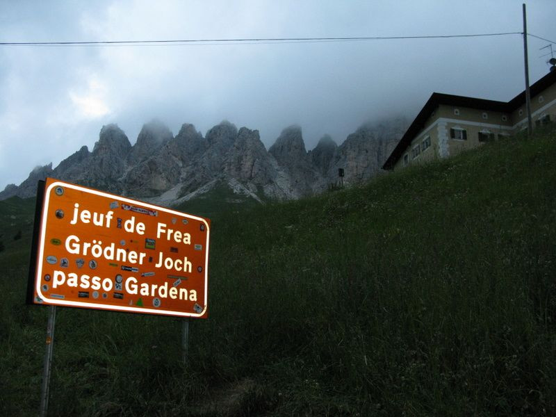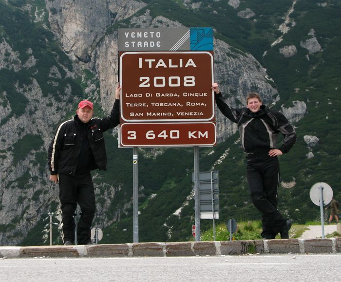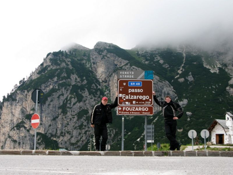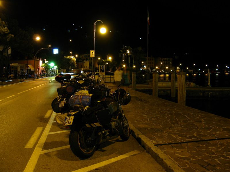 Dalšími zatáčkami z kopce a zas do kopce dobýváme Passo Di Falzarego. Je přesně osm, když se fotíme u cedule a situaci hodnotíme jako ne již úplně veselou. Přes kopec se valí mraky, podezřele se setmělo, začíná nenápadně kosa a nikde nikdo. Navrhji ubytovat se na nejbližším místě v okolí (což by v reálu nebylo tak jednoduché) a vyjet zítra o to dříve ráno a dohnat plán. Kompromisem je nakonec zvolit nejkratší cestu na dálnici a "jet do mrtvejch", předběžným cílem bylo Trento. Cesta vede přes další passo zcela prázdnou silnicí, což mimo jiné značí, že si jí lze patřičně užít. Malinko chvátáme, abychom někam dojeli v rozumnou dobu. V podhorské obci jsem plánoval doplnit palivo (celková zásoba benzínu v rámu na 240 kilometrů není nic moc na tůry pustinou), ale místní Shellka je podivně opuštěná. Až po několika dalších kilometrech mi dochází, že v chytrých průvodcích bylo jasně psáno, že italské benzínky se brzo zavírají a často jsou zcela samoobslužné. Když jsem zcela špatným směrem najel na dálnici, další pumpa už byla běžného vzezření a místní pan obsluha uměl dokonce malinko česky. Byla noc, chládek a zcela jasno, že dneska už ubytování za velké peníze nemá na tu chvíli smysl. Shodneme se na dobytí cíle po dálnici a míjíme Trento, abychom slavnostně v 0:40 dorazili do Nago Trobole na břeh Lago Di Garda. A pak že to nedáme!