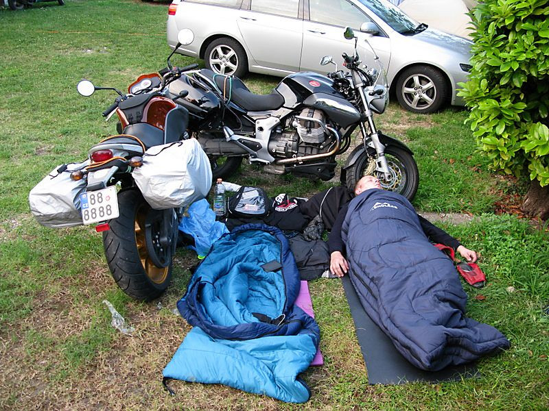 Daleko vtipnější se ukázala problematika otevřeného a prázdného kempu. Vypátrali jsme sice otevřený, leč zcela plný. Poté některé zavřené. Nakonec kolem druhé hodiny uléháme pod motorky v kempu, kam jsme se vetřeli bez ohlášení, a ještě zabrali jediný volný flek před druhými vraty.