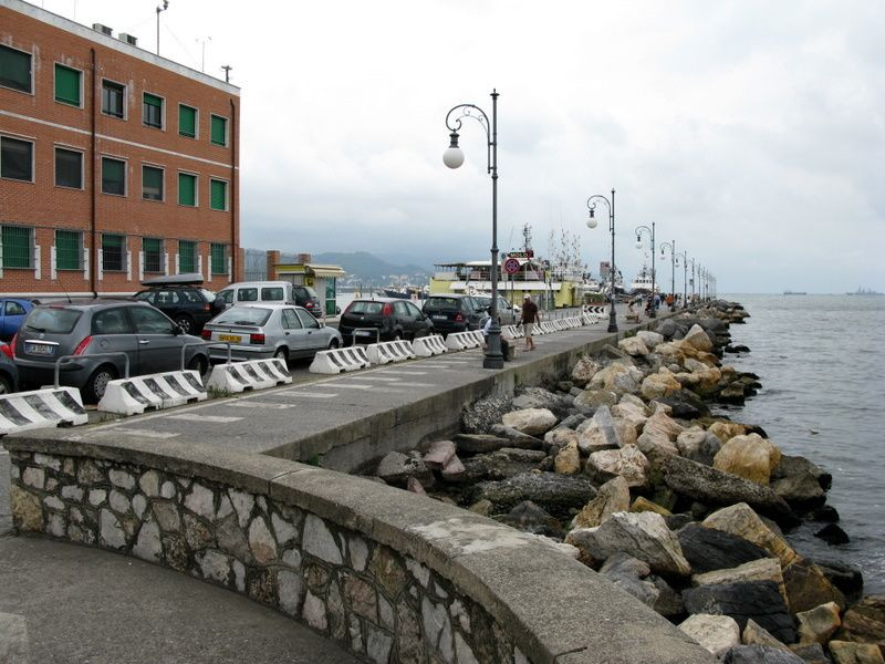 V přístavu La Spezia se fotíme s dosaženým cílem - mořem. Spousta vody na jednom místě, tedy nic na dlouhé zdržení, aspoň prozatím. Vyrážíme raději hledat ubytování. Na parkovišti se kufr Brevy střetá cizí vinou s vozidlem Smart. Ukecaná Italka nacouvala do motorky dvakrát, než dostala rozum. Nicméně byla dle obecného konsensu vskutku "italsky" krásná. Nutno podotknout, že Smart vyvázl s daleko většími šrámy na zadním blatníčku, než samotný motokufr.