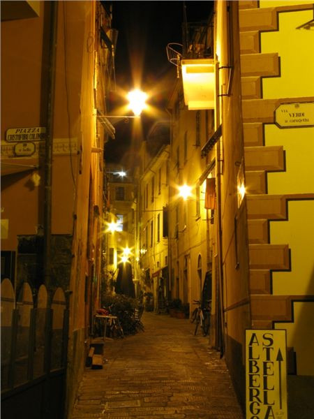 Tomáš odpadá do postele. Dnes bylo ovšem v plánu prozkoumat Cinque Terre - téměř nepřístupné rybářské vesničky nalepené na skalách. Odstrojený stroj vybavuji pouze navigací a sám vyrážím na 22 kilometrů dlouhou cestu k pobřeží. Tma, serpentiny, nikde ani světýlko, až na náhodné odrazky v některé zatáčce. Svět se zmenšil na kužel světla, klikatou fialovou čáru na displeji přede mnou a zvuk dvouválce. Jedu padesátkou, na dvojku. Kdyby se mi tu něco stalo, vypověděla motorka nebo navigace, těžko říct, co si tu počít. Nepamatuji si ani jméno naší vesnice, natož cestu domů. Dobrodružství nabývá nového rozměru po vjezdu do mlhy, či nízko se válejícího mraku. Velká legrace. První světýlka v dálce mi však dodají optimismu.