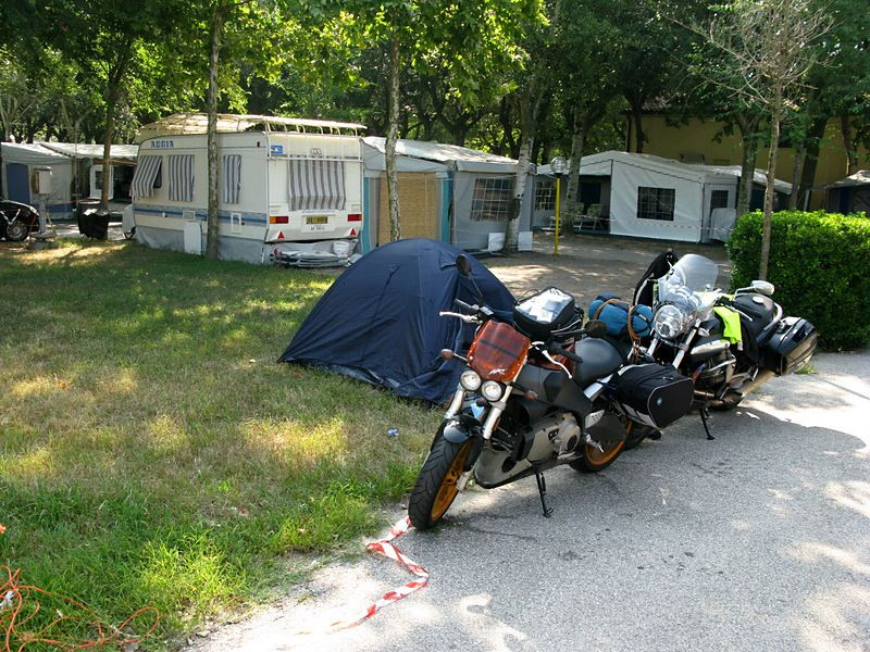 Sedmá hodina dávno za námi a pár set kilometrů naopak před námi. Shodujeme se tedy na nejkratší cestě k Benátkám. Nudná dálnice, noční bloudění silničkami, pobřeží... Po neobvykle krátké době nalézáme otevřený kemp ve městě Chioggia, legálně stavíme stan a dnes končíme celkem zdárně před dvanáctou.