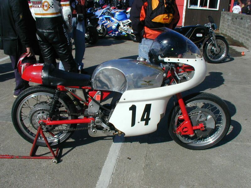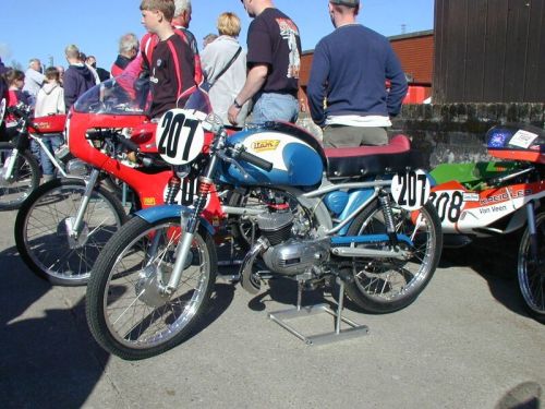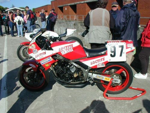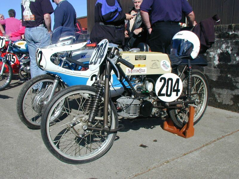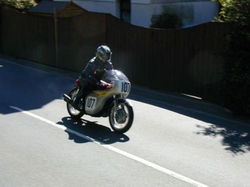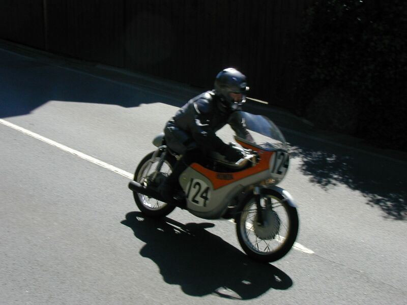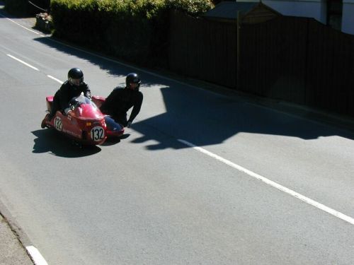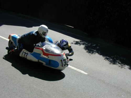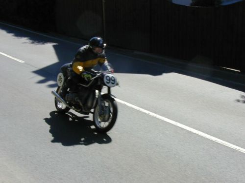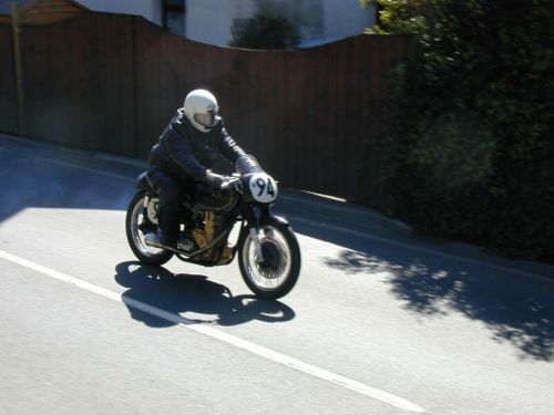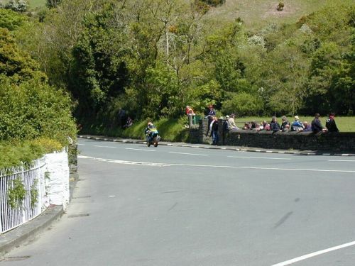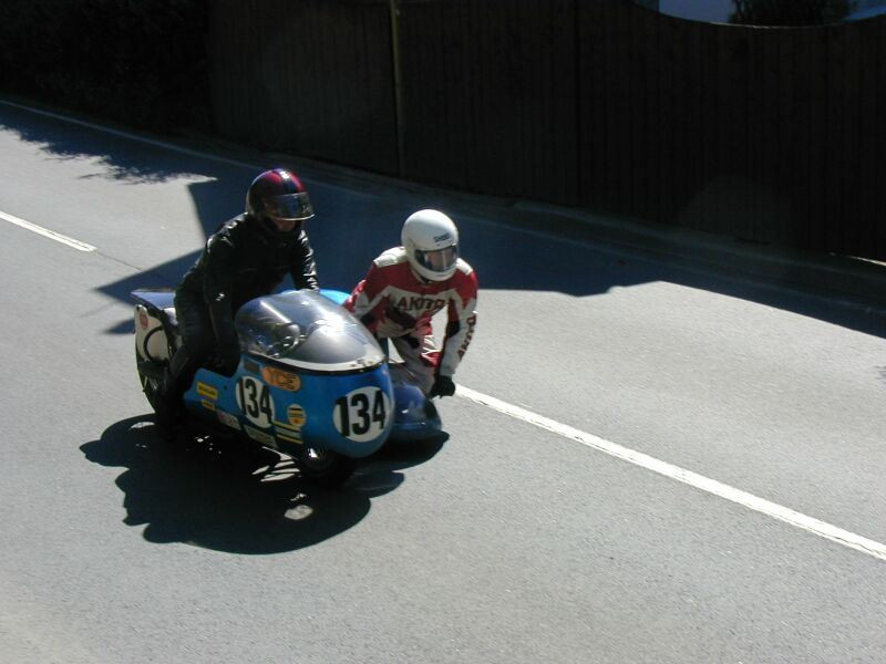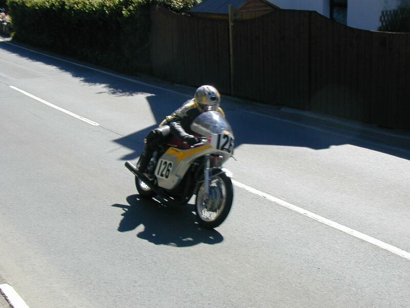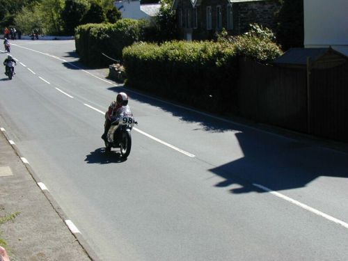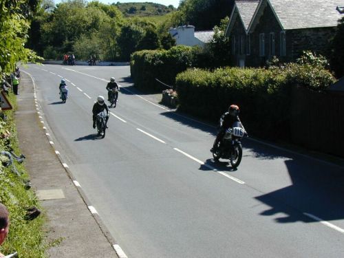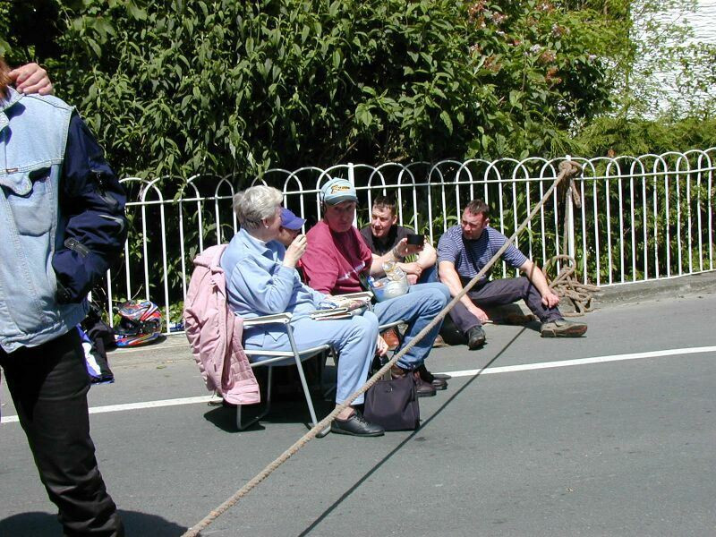 Usídlili jsme se na křižovatce hlavní Peel Road a Poortown Road (po které jsme přijeli), zrovna dobíhá závod čtyřstovek. Tak se zatím věnujeme prohlídce několika vzácných a exotických kousků a sledujeme zpovzdálí závody a diváky. Mne okouzlí starší dvojice, manželé sedí na přinesených pohodlných židličkách, pán sleduje projíždějící stroje a hlásí jejich čísla, paní zapisuje časy do předtištěnému programu. Kouzelní, a jak typicky angličtí :-)))).