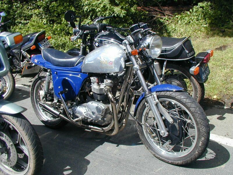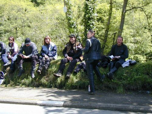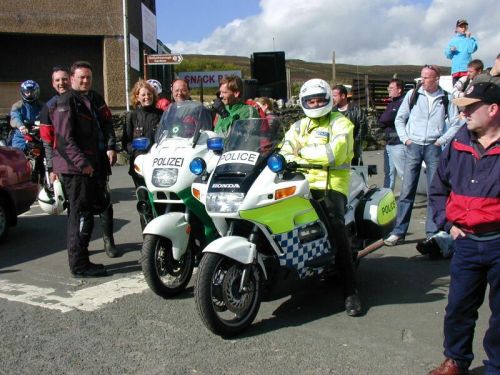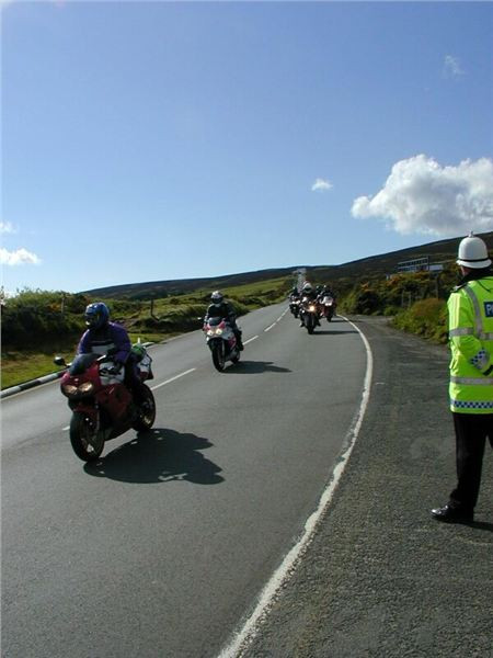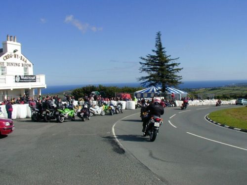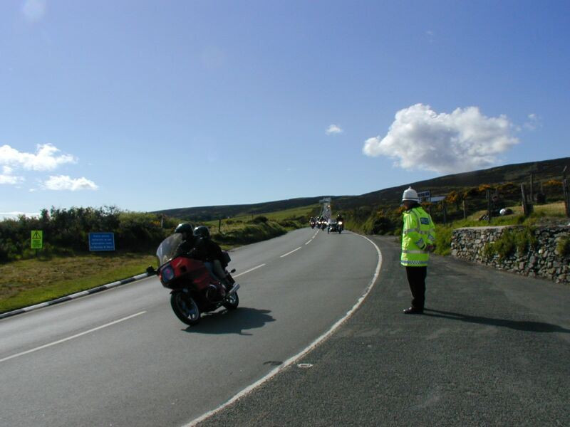 Při sjezdu dolů se blížím k ostré pravé u hotelu Creg-ny-Baa, před nímž parkuje hafo motorkářů, a vida, jsou tu i naši.... Tak se jako poslední přidružím ke grupě Čížků. Asi půlhoďku tady vydržíme, kolem rytmicky pulzuje nekonečný had z motorek co jich jen svět vyrobil. Pár bobíků v zelených pláštích tohle hemžení jen sleduje s pobaveným výrazem ve tváři. Taky tady parkují dva motopolicajti, jeden místní na ST a druhý, německý, na RT. Proč Němec? No, je to poměrně jasný, dosti značnou část návštěvníků jsou ti z rajchu.