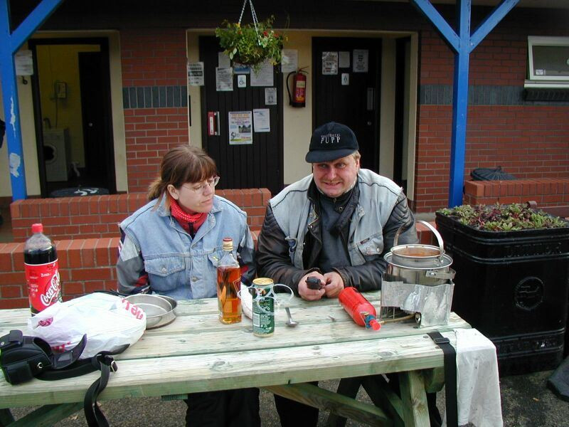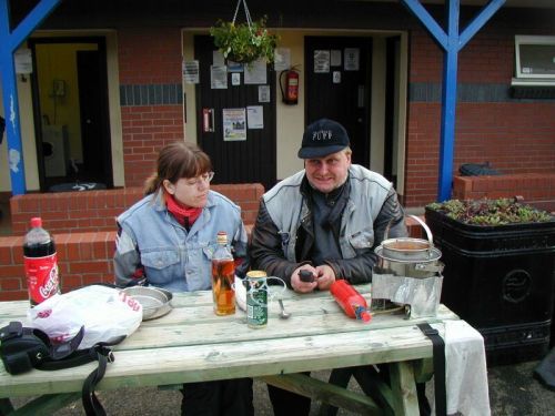 V pohodě se šineme tratí TT až ke světelné křižovatce, kde většina jede vpravo, já a pár dalších míříme rovně na Peel. Po sedmé zajíždím do stále řádně rozbahněného kempu, nikdo z našich doposud není, jsu tu pěrvyj. Jen co se ale trochu orazím a převlíknu, dorazí zbytek. A že jsou všichni hladovi, tak se po chvilce sejdeme nejprve v kuchyni a pak u jednoho z venkovních stolů. Je sice chladněji, ale neprší, no a alkohol brzy zažene rtuť pomyslného interního teploměru o řádný kousek výše.