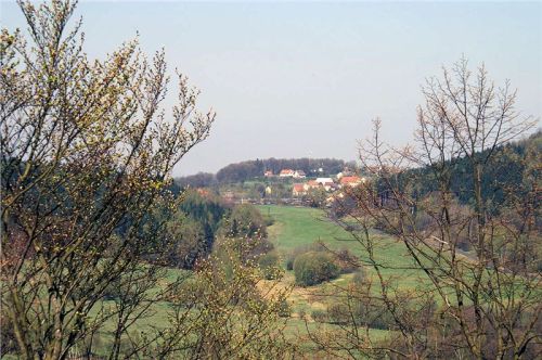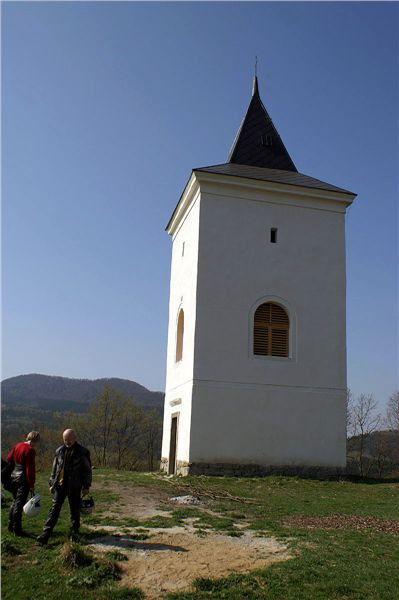 Prudkým výjezdem po značně rozdrbané okresce se vysápneme až na malé, tiché až ospalé, náměstíčko. Tomu vévodí neobvyklý kruhový kostel, zrenovicírovaná hospoda a obecní úřad, my však nejprve popojedeme kam až to jde, vyfuníme krátký leč šťavnatý výstup a už jsme u čerstvě opravené solitérní zvonice (N50 36.730 E14 17.042).