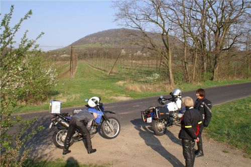 Naše cesta pokračuje přes Liběšice pořád dál na S. Kolem je už na co koukat, zapadli jsme do typického kopcovitého kraje Českého středohoří. Nahoru, dolů, doleva, doprava, silnička se motá jak užovka pod vlivem, k tomu navíc malebná krajina kolem, pomalu mne opouští naprdnutost a do duše se rozlévá pohoda.