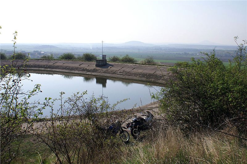 Jindrou spatřená stavba je ještě kousek vejš přes pole, tak se k ní s ženskejma vydá. Mě je docela hic a vedro, leje ze mě jako vloni v Bergenu, tudíž zůstávám (znaven a naprdnut z vývoje událostí) u vody a motorek, potřebuju se uklidnit. Díky tomu se mi ale podaří objasnit účel stavby. Vyzpovídám muže s vnoučkem na procházce, a je to přesně jak jsem tušil. Závlahová nádrž, voda je čerpána z dva kiláky vzdáleného Labe. O kousek dál je prý druhá identická. 1:3.
