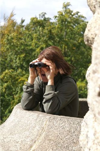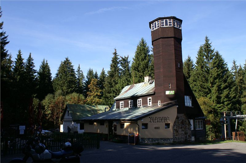 Rozhledna se nachází ve výšce 976 m a zdolání cesty k ní nebyla jednoduché. V polovině kopce končí asfalt a začínají kameny a drť. Cesta je jen trošku zpevněná, tak to s námi pěkně hází ze strany na stranu. No ještě že máme enduro. Šťastně dorazíme pod vrchol, zpět již ten nejhorší úsek šlapu pěšky, aby Jirka měl větší manévrovací schopnost. Výhled z této kamenné rozhledny, vysoké 24 m, je vskutku slovy nevypověditelný. Pohled z jejího vrcholu obsáhne celé střední a západní Krušnohoří, velká i menší městečka jsou odtud jak na dlani.