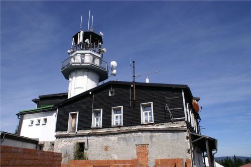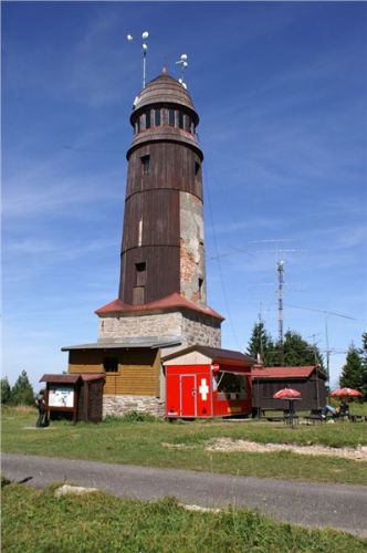 Rozhledna je vysoká 21 m a byla vystavěná v roce 1913 z kamene a dřeva, až na vrchol vede kvalitní šotolinová silnička. V okolí vrcholu se vyskytují žulové skalní útvary a balvany, na svazích propadlé štoly. Zvláště mě zaujala fotografie místa nazvaného Vlčí jámy, což jsou propadlé štoly s tvorbou jeskynního ledu, no zase jedna věc, kterou jsme nechali na nějakou z příštích návštěv. Vzhledem k umístění stánku občerstvením v blízkosti rozhledny a pokročilé hodině řešíme na tomto místě ukojení našich hladových žaludků (Jirka sekaná, já sýr, společně rybičky a Matonka).