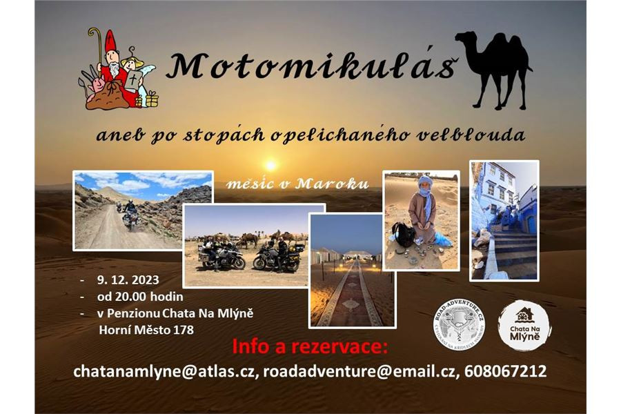 Cyklus motocestovatelských přednášek v penzionu Chata Na Mlýně v Jeseníkách bude pokračovat i na Mikuláše, přesněji 9. 12. 2023, kdy si poslechneme vyprávění o měsíčním putování na moto cestou i necestou po všech barvách, chutích, vůních i výškách Maroka – Atlas, Sahara, Atlantik, Středozemní moře i marocké podzemí.