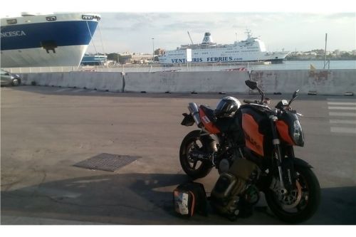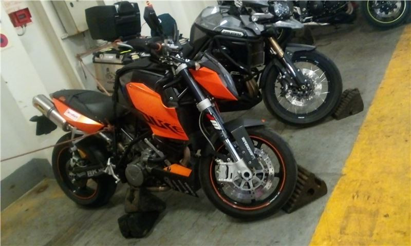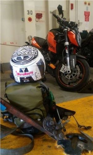 Já se vydala do garáží. Opět jak vánoční stromeček a trošku se strachem, zda bude motorka stát, nebo ležet… Než jsem se prokousala dolů, uběhlo snad dvacet minut. Motorka stála a už nebyla uvázaná. Posádka evidentně nemíní riskovat časové prodlevy… Než jsem vše nasadila na sebe a upevnila na bajk, najížděly už další kamiony a auta na palubu.