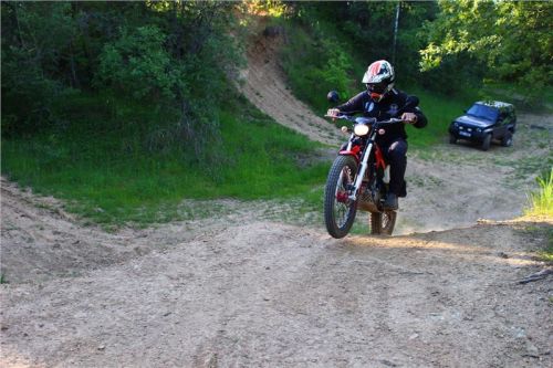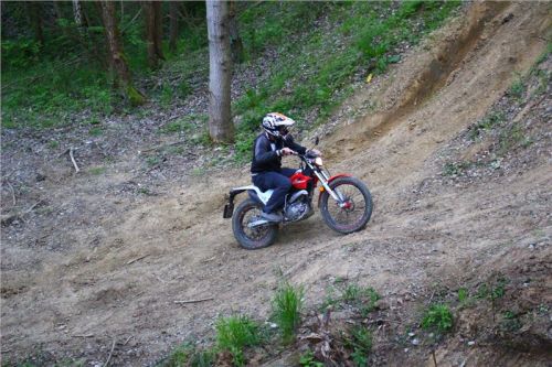 První, co se dostavilo, bylo nadšení, jak je motorka obratná, ochotná šplhat do prudkých schodů, překonávat překážky jako klády, kameny, prudké sjezdy, přechody... Bomba, prostě šlapajda. 85 kilo s plnou nádrží a 260 kubíků ve čtyřtaktním motoru se jeví jako velmi slušná kombinace vlastností a parametrů pro neomezené „kravení“ v jakémkoli terénu. A přitom se k němu dostat po vlastní ose a ne na vleku, jak je u šlapaček vhodnější a snesitelnější.