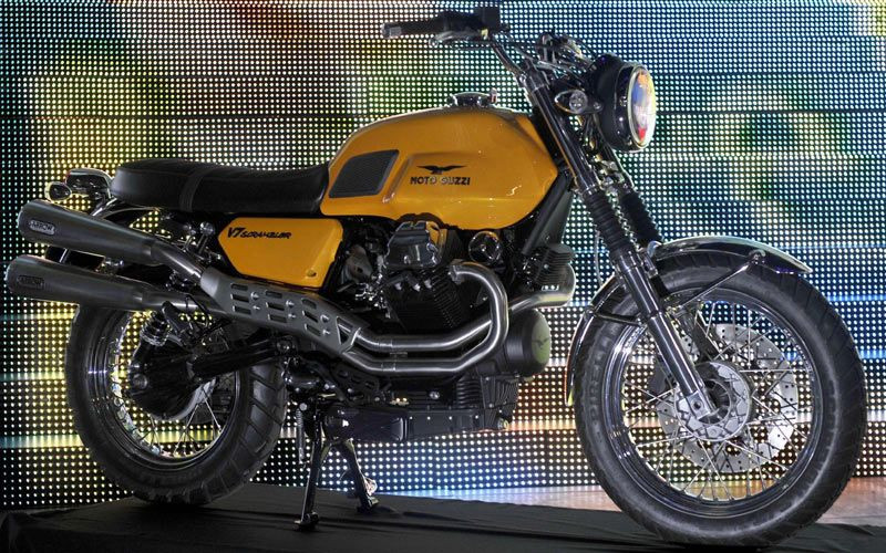 “Mnohem více klasik, ale stejně fascinující, Moto Guzzi V7 Scrambler je postavena na základě rámu V7 Classic s malým motorem 750 ccm."