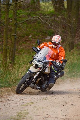Promluvme si o hvězdě jeviště: vzduchem chlazený 90° podélně uložený dvouválec do V s rozvodem OHV a dvěma ventily na válec, pýcha a tradice orla z Mandella. S objemem 853 ccm a použitím materiálů, jako je titan, což běžně vídáme spíše na závodních strojích, dává V85 TT ještě bujnější a divočejší charakter.