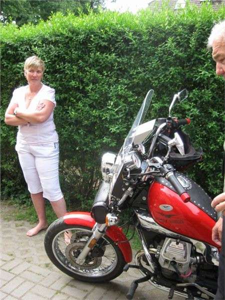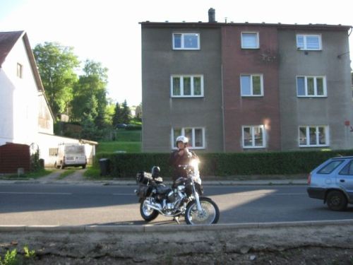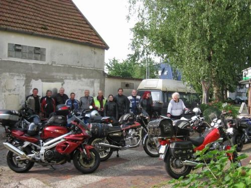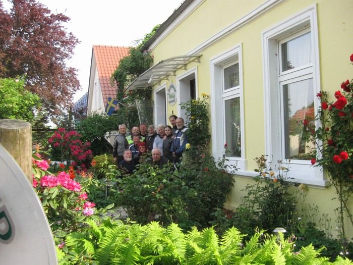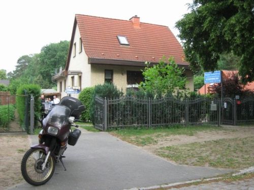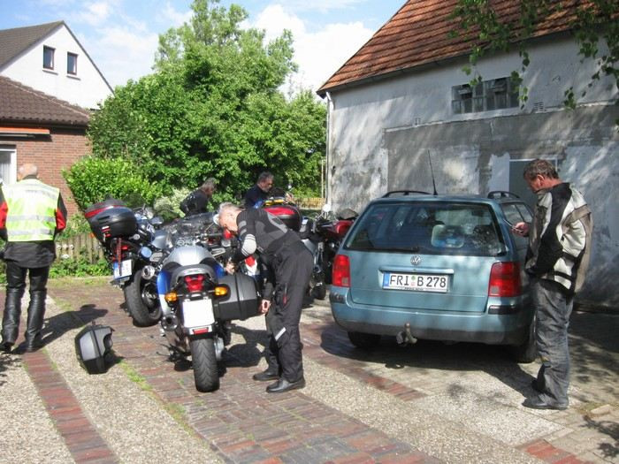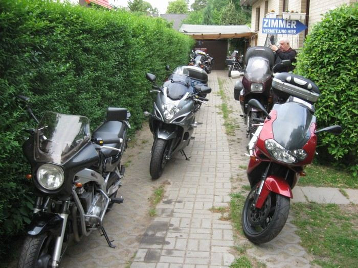 Pan Bünting nás navigoval na parkoviště - tady sice otevřené, ale byli jsme ubezpečeni, že se u nich ještě nikdy nic neztratilo, ani nepoškodilo. Proč bychom tomu neměli věřit? Pokud někdy pojedete na sever Německa, doporučuji tohle ubytování! Budete se cítit jako doma, a to nepřeháním. Platili jsme kolem 25 EUR za osobu a noc, včetně snídaně. Pan a paní Bünting nám vyšli ve všem vstříc, narychlo zorganizovali ještě 3 postele u 94 leté sousedky přes ulici. Jejich syn Peter je taky motorkář, dobře jsem si s ním popovídala. Dal nám několik tipů na sobotní cestu ze Sande do Falkensee, abychom se svezli mimo dálnici. Vypadalo to moc hezky, ale bohužel pak nebyl čas...