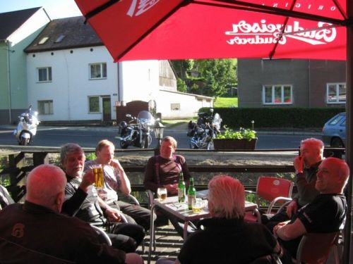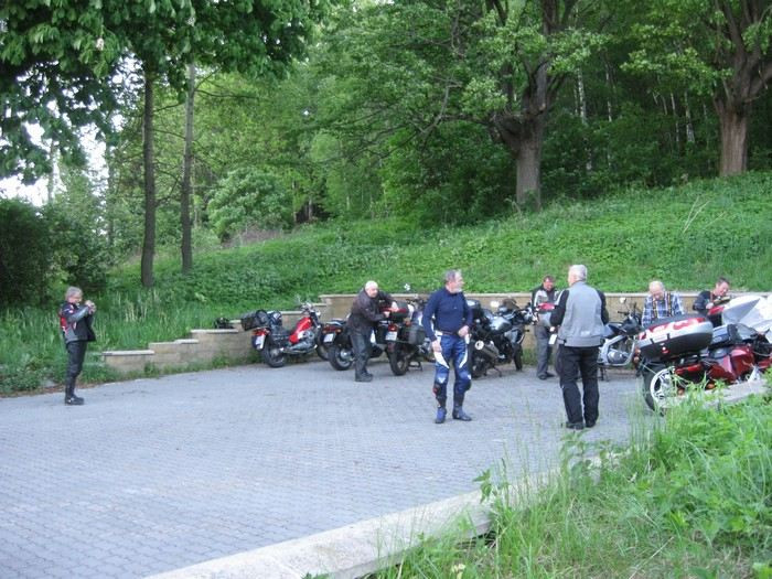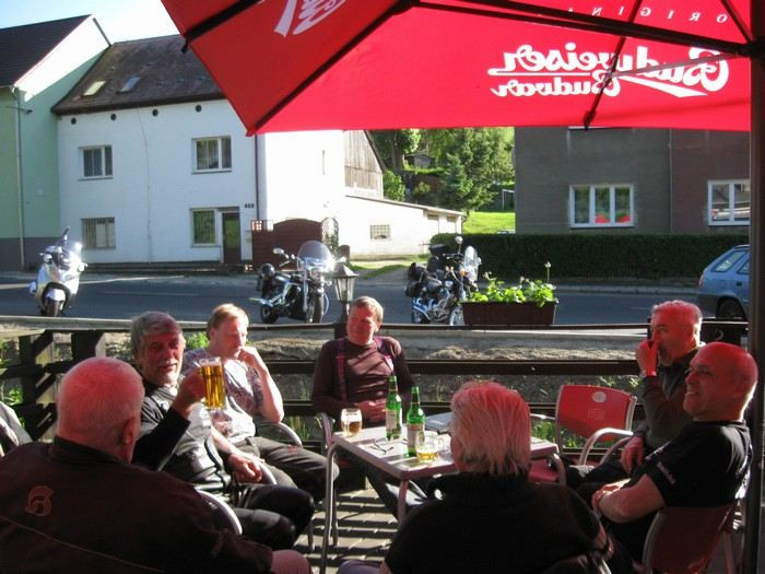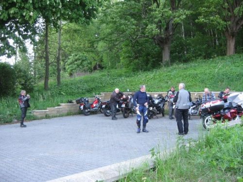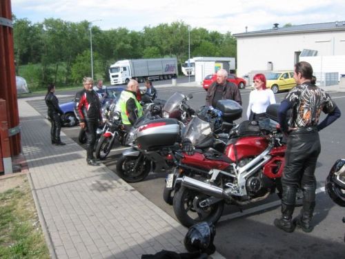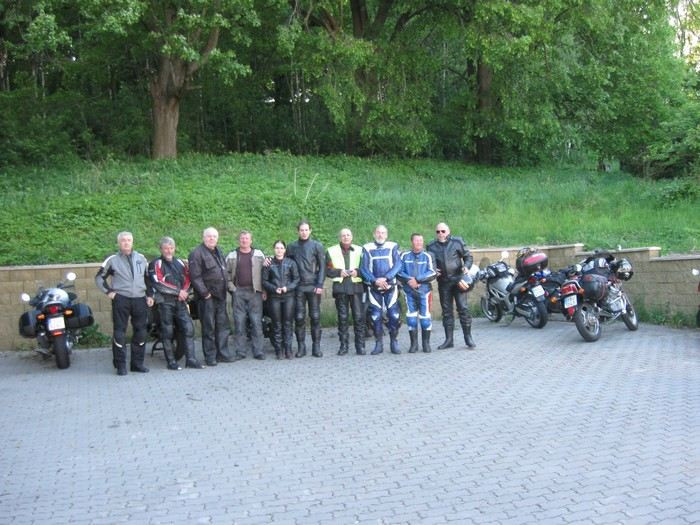 . Ale nakonec se rozumně rozhodl a vrátil se domů, takže zbylo 9 motorek a 10 lidí: Milamoto, Mirek42, Miko, LUSO, Leo1200, Esvéčko, Dědkulín, jeho kamarád Charlie1 s přítelkyní a já. Motorky od půllitru po dvanáctpade, věk účastníků od cca 30 do cca 65 let. Jen zlomek z velké prima party, která si říká Motorkáři nad 60 roků, nebo taky Motodědci: