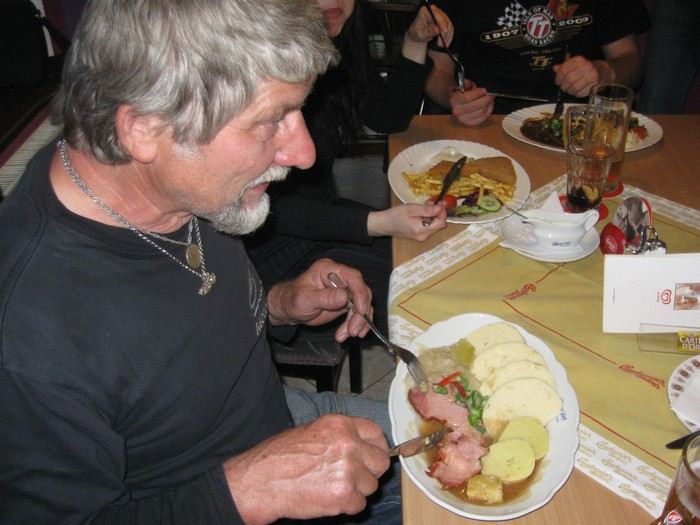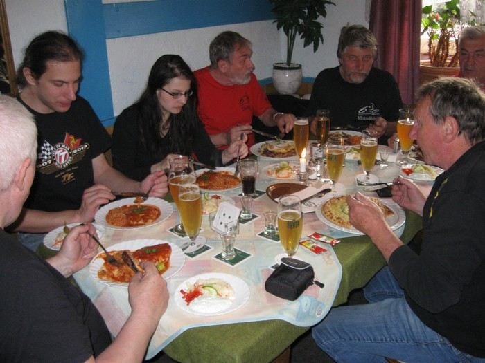 www.Pension-Hamburg.de (cena za osobu a noc se snídaní 25 EUR) bylo sice skromnější, ale mašiny byly všechny za bránou, některé dokonce pod střechou. A paní domácí byla velice příjemná a ochotná.Vzhledem k tomu, že supermarket byl dost daleko, naložila mě a Mirka do auta a odvezla nás na nákup. Dokonce nás chtěla po skupinkách odvozit do řecké restaurace! To jsme s díky odmítli a šli do pizzerie. Tady už nebyl majitel tak přátelský, jako Řek v restauraci Athén v Sande, ale i tady jsme se dobře najedli a popili oblíbené kvasnicové pivko.