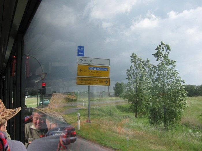 Počasí nám přálo: slunce svítilo od rána, s přibývajícími kilometry bylo čím dál větší teplo. Až moc v černé kůži... Ale bezpečnost především! Na dálnici nebyl žádný hrozný provoz, byl pátek ráno... Místy stavební práce, takže zúžení do jednoho pruhu, což znamenalo plížit se 60 km/h v horku a prachu. Ale stejně jsme jeli rychleji, než jsme čekali, přestávek bylo také méně, pokud se pamatuji dobře, tak tři, takže kilometry ubývaly. Jeli jsme na Dresden, Leipzig, Magdeburg, Braunschweig, Hannover, Bremen, Oldenburg, Sande. Když jsme minuli Hannover, měli jsme dojem, že jedeme do pěkné bouře. Začalo foukat a my jsme místy plápolali po celé šíři pruhu (trochu dramatizuji, ale pocit to nebyl příjemný). Směrem na sever, kam jsme měli namířeno, visela z oblohy až skoro k zemi šedivá a béžová mračna! Zastavili jsme na odpočívadle asi 70 km před cílem, odkud jsem zavolala do penzionu, že se blížíme.