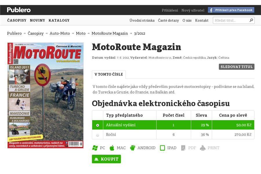 Nově zakoupíte ve virtuální trafice i MotoRoute. A to nejlepší nakonec - při koupi elektronické verze magazínu MotoRoute ušetříte. Jednotlivé číslo stojí 50 Kč (oproti 70 Kč na stánku), roční předplatné vyjde na 270 Kč (oproti 369 Kč u tištěné verze).