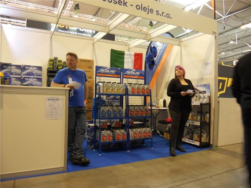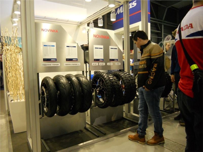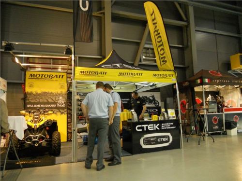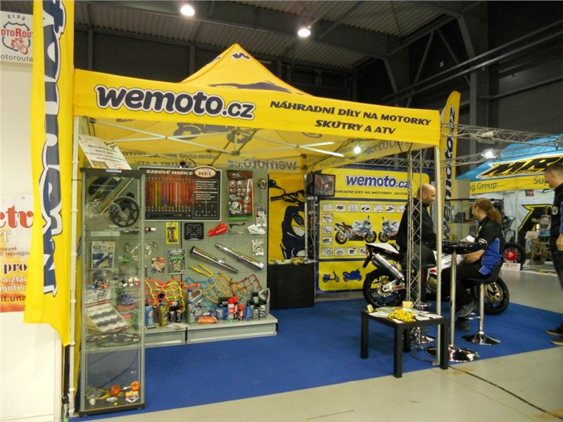 Hned vedle našeho stánku je žlutomodrý stánek firmy Wemoto, která myslí na všechny ty, co chtějí mít svou motorku po technické stránce v pořádku. Prodává náhradní díly, které budeme všichni potřebovat pro jarní servis. Brzdové destičky, řetězy, oleje, filtry a další potřebné výrobky.