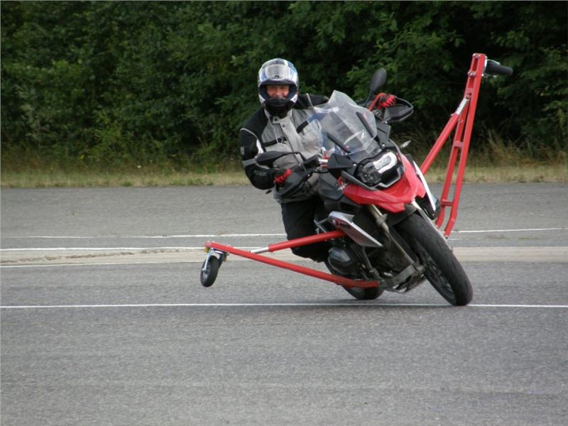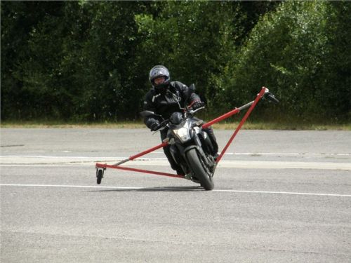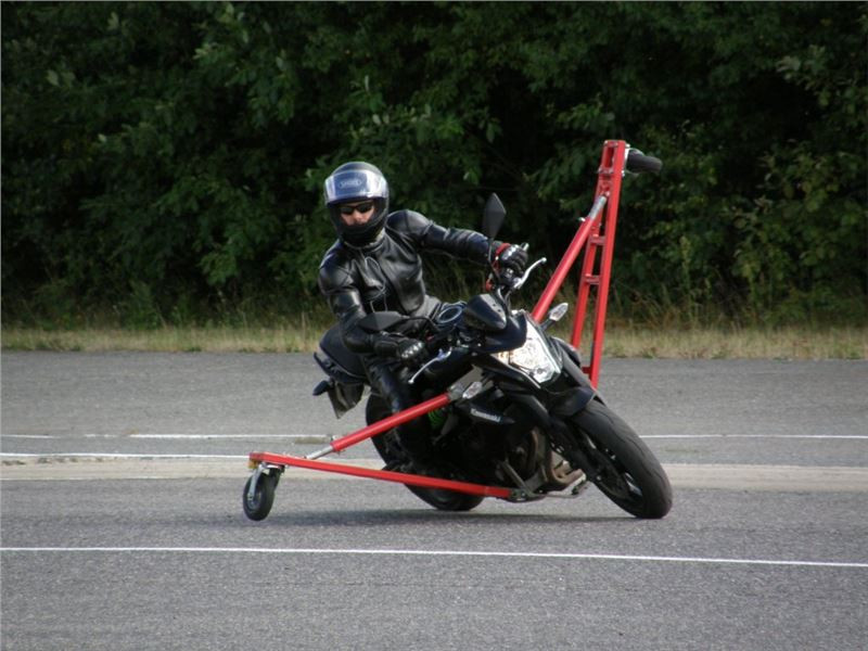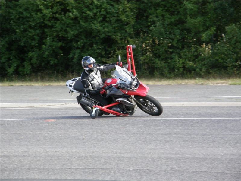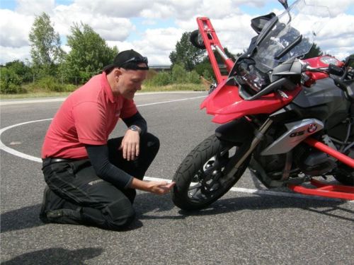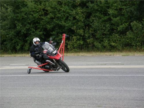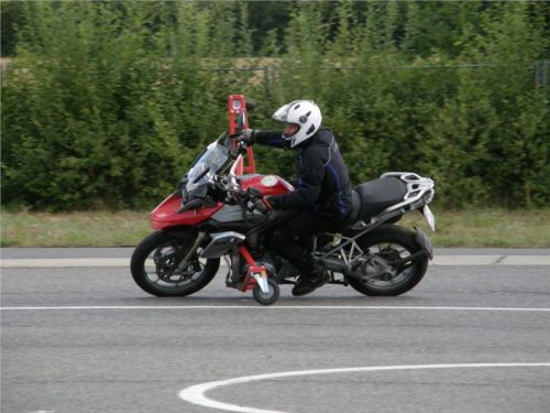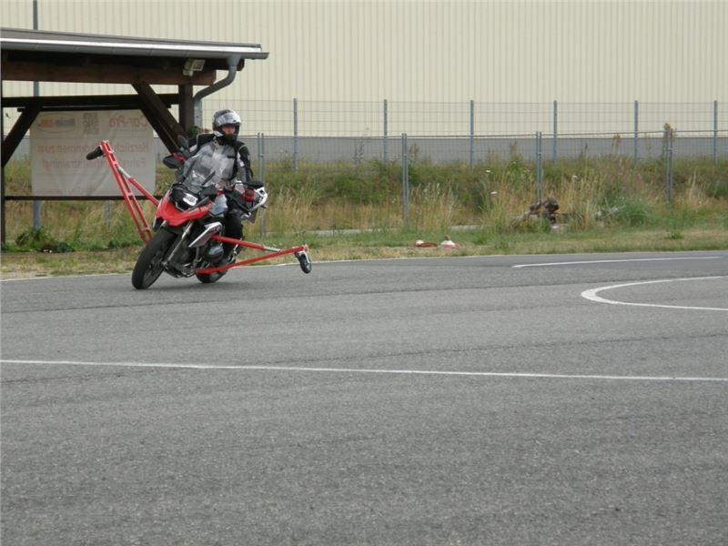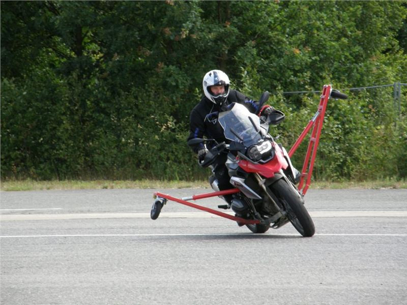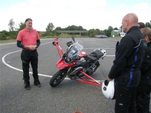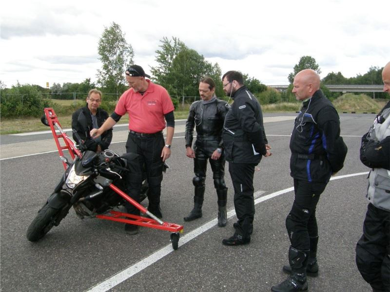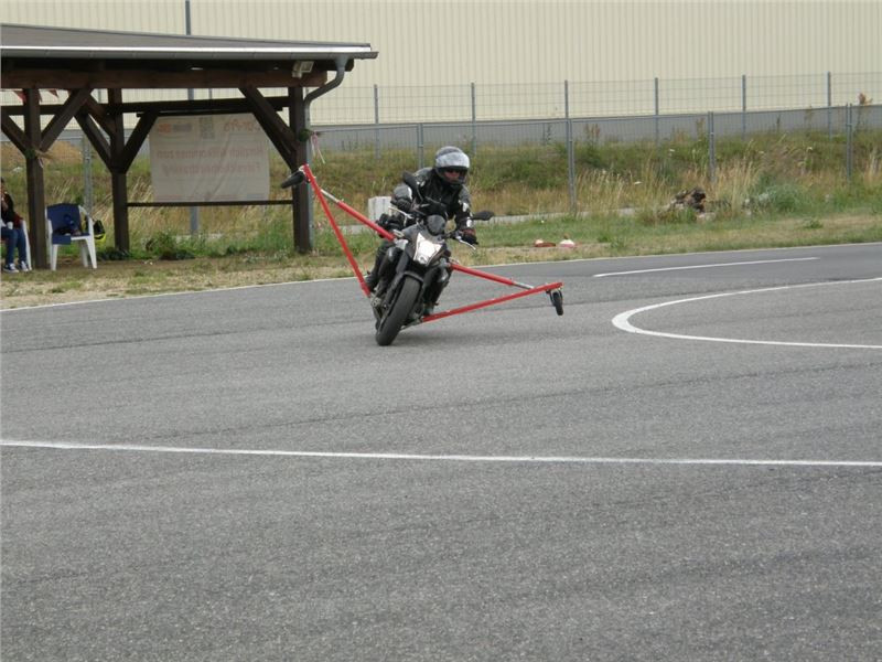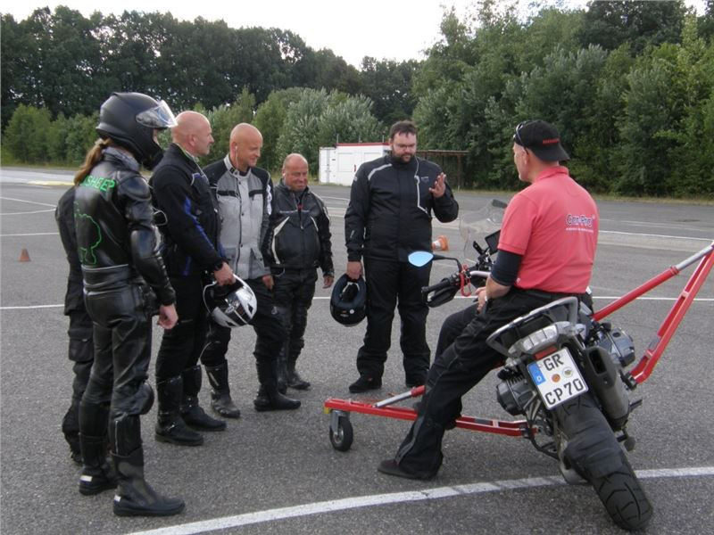 Venku stojí dvě motorky, GS 1200 a Kawasaki ER-6n, obě s namontovanými křidélky. Ono to označení asi není úplně správně, ale sami majitelé školy tyto přídavné konstrukce s opěrnými kolečky takto nazývají, proto se s tím rád ztotožňuji a těším se na první svezení. Tomu však předchází rozprava o základech fyziky, úzce související s jízdou na motorce. Gyroskopické jevy, styčná plocha pneumatik s vozovkou při zrychlování a brzdění, při jízdě rovně a do zatáčky. V jedné mnou neoblíbené pohádce se zpívá: statistika nuda je, má však cenné údaje. Záhy si člověk uvědomí mnoho souvislostí, o kterých ví nebo minimálně už někdy dříve slyšel, ale tak nějak na ně za běžného provozu nemyslí. Car-Pro® Akademie GmbH nenechává nic náhodě a kurzy rozděluje do několika kategorií od náklonu 35° pro začátečníky, až pro pokročilé do 50°. S ohledem na osobní přístup ke každému účastníkovi a dostatek času k výuce je v každé lekci maximálně 6-8 jedinců, podle typu kurzu. Tím si uvědomuji, že v mnou vybraném celodenním kurzu jsem sedmé kolo u Tatry, ale Frank má vše pod kontrolou a časový plán nijak nenaruším. Navíc, pro všechny případy a úplné začátečníky, je v garáži zaparkovaný třetí motocykl, konkrétně BMW 310 GS, takže každý má svou jízdu jistou.