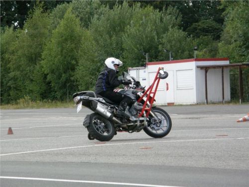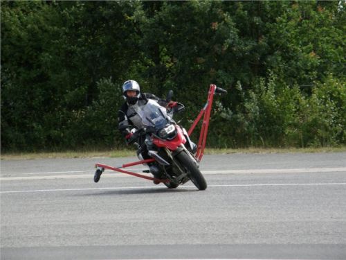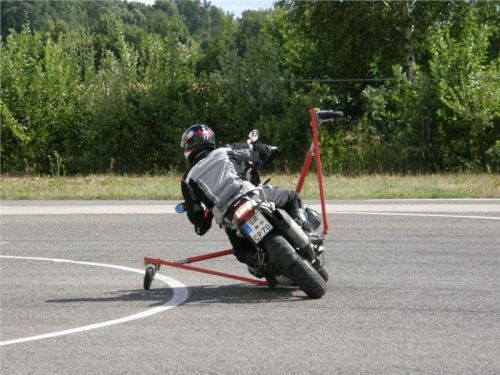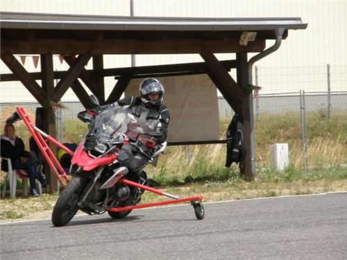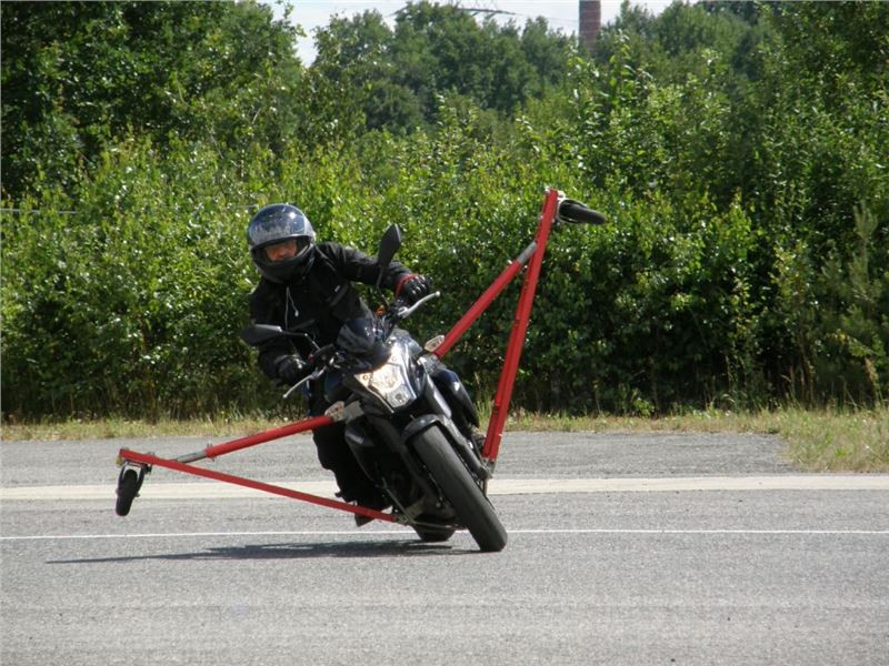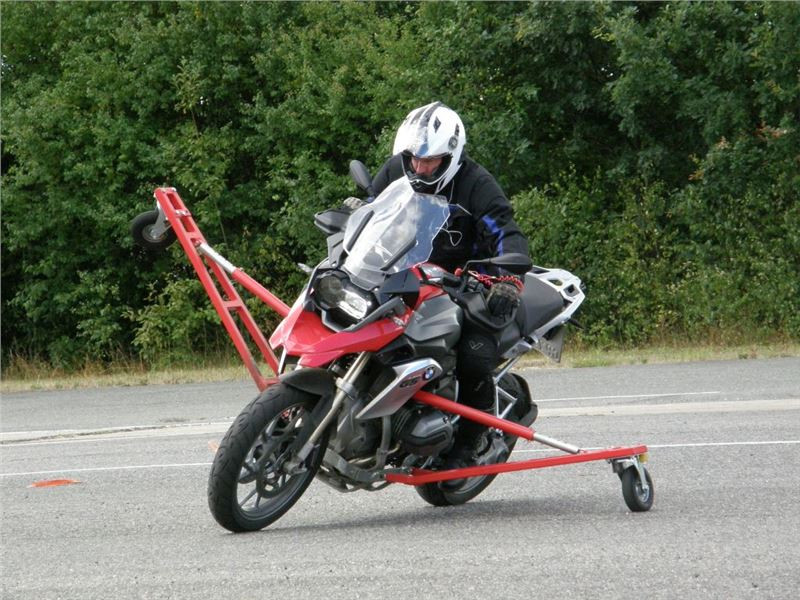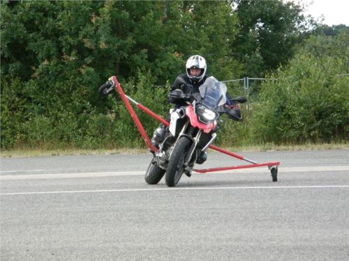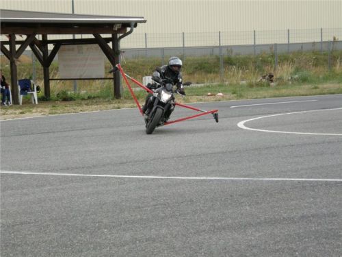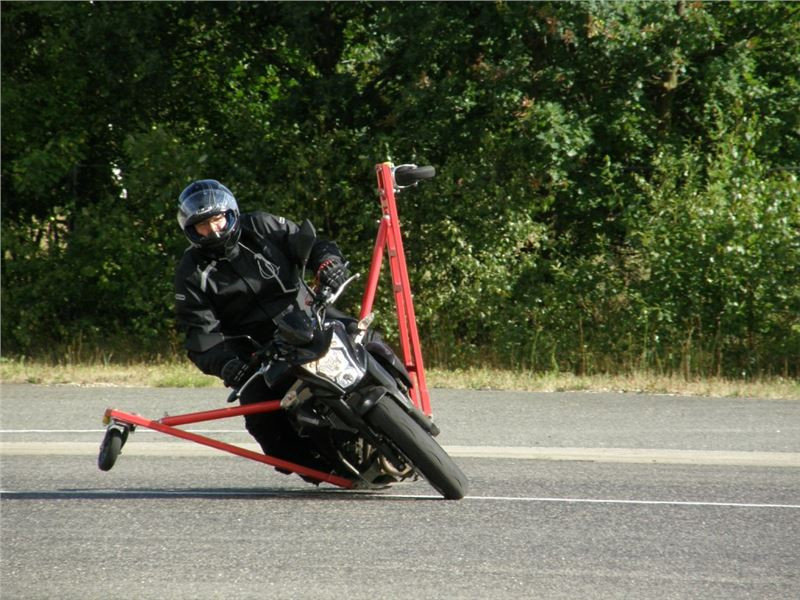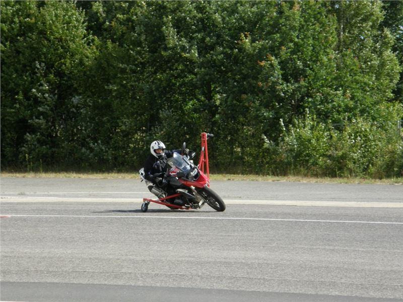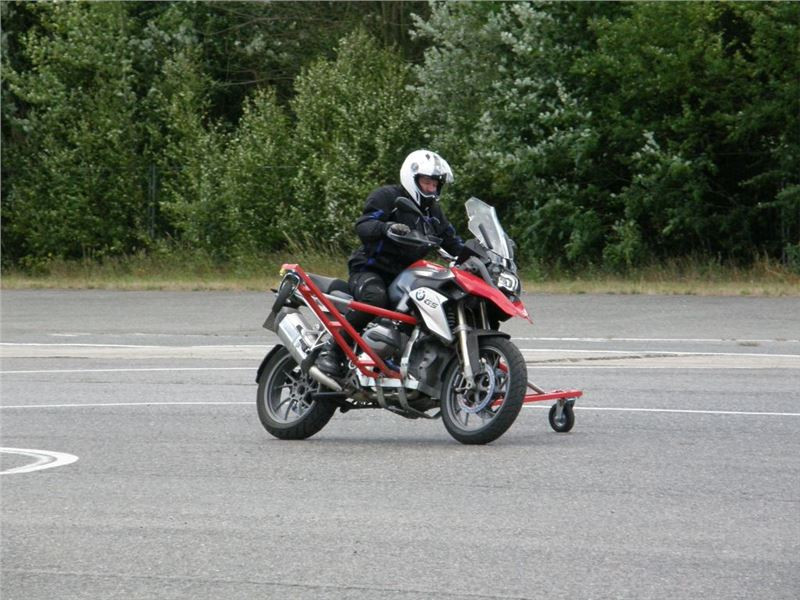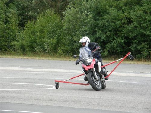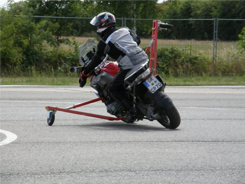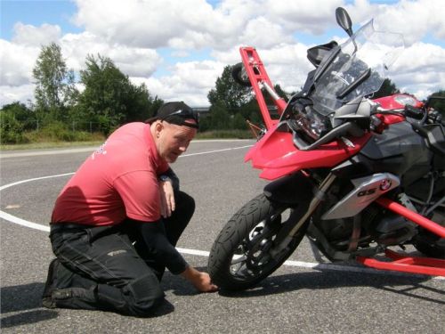 Venku stojí dvě motorky, GS 1200 a Kawasaki ER-6n, obě s namontovanými křidélky. Ono to označení asi není úplně správně, ale sami majitelé školy tyto přídavné konstrukce s opěrnými kolečky takto nazývají, proto se s tím rád ztotožňuji a těším se na první svezení. Tomu však předchází rozprava o základech fyziky, úzce související s jízdou na motorce. Gyroskopické jevy, styčná plocha pneumatik s vozovkou při zrychlování a brzdění, při jízdě rovně a do zatáčky. V jedné mnou neoblíbené pohádce se zpívá: statistika nuda je, má však cenné údaje. Záhy si člověk uvědomí mnoho souvislostí, o kterých ví nebo minimálně už někdy dříve slyšel, ale tak nějak na ně za běžného provozu nemyslí. Car-Pro® Akademie GmbH nenechává nic náhodě a kurzy rozděluje do několika kategorií od náklonu 35° pro začátečníky, až pro pokročilé do 50°. S ohledem na osobní přístup ke každému účastníkovi a dostatek času k výuce je v každé lekci maximálně 6-8 jedinců, podle typu kurzu. Tím si uvědomuji, že v mnou vybraném celodenním kurzu jsem sedmé kolo u Tatry, ale Frank má vše pod kontrolou a časový plán nijak nenaruším. Navíc, pro všechny případy a úplné začátečníky, je v garáži zaparkovaný třetí motocykl, konkrétně BMW 310 GS, takže každý má svou jízdu jistou.