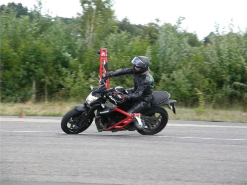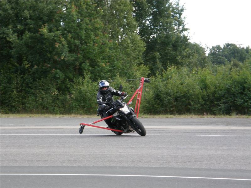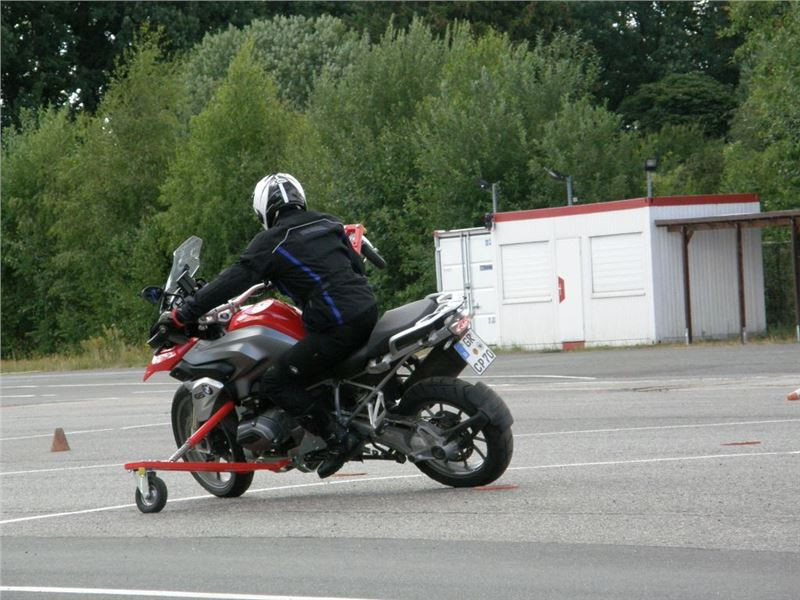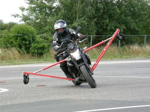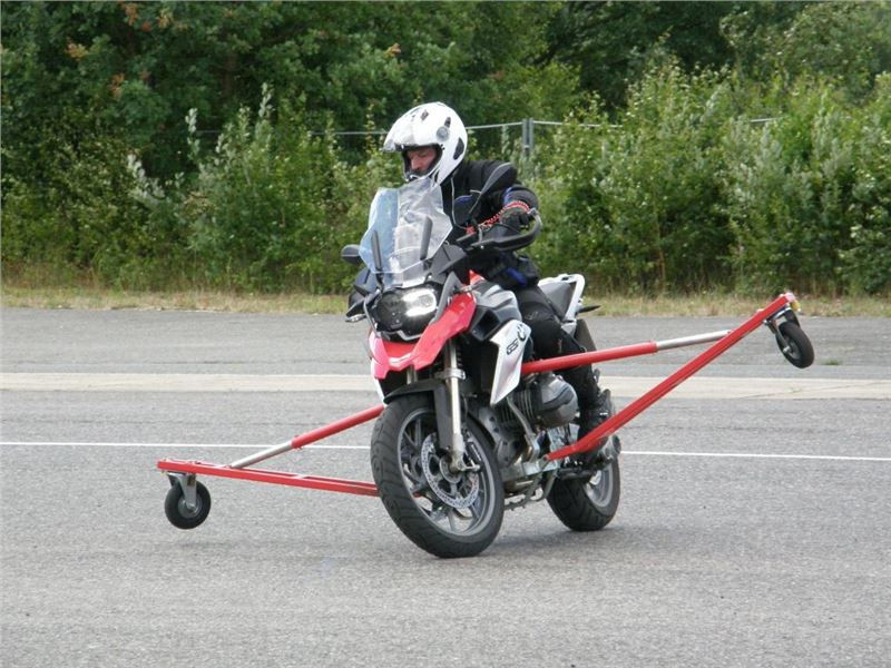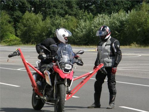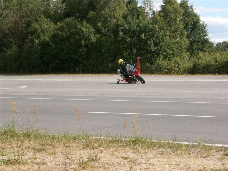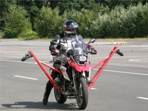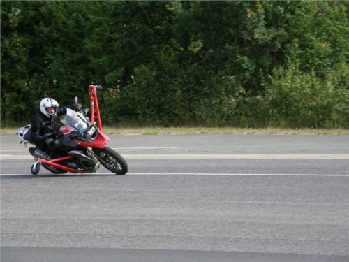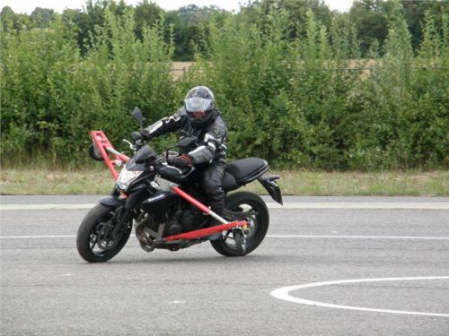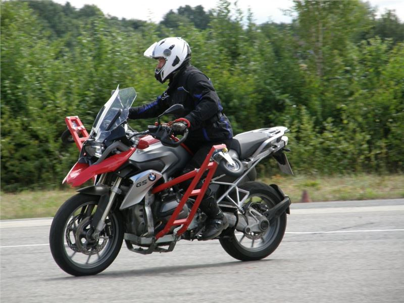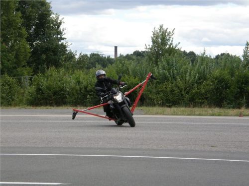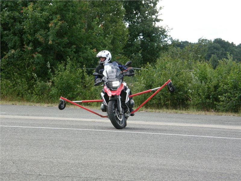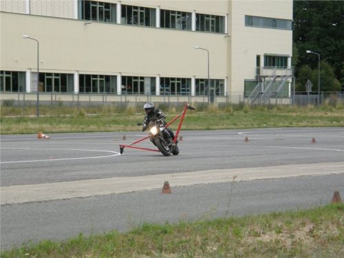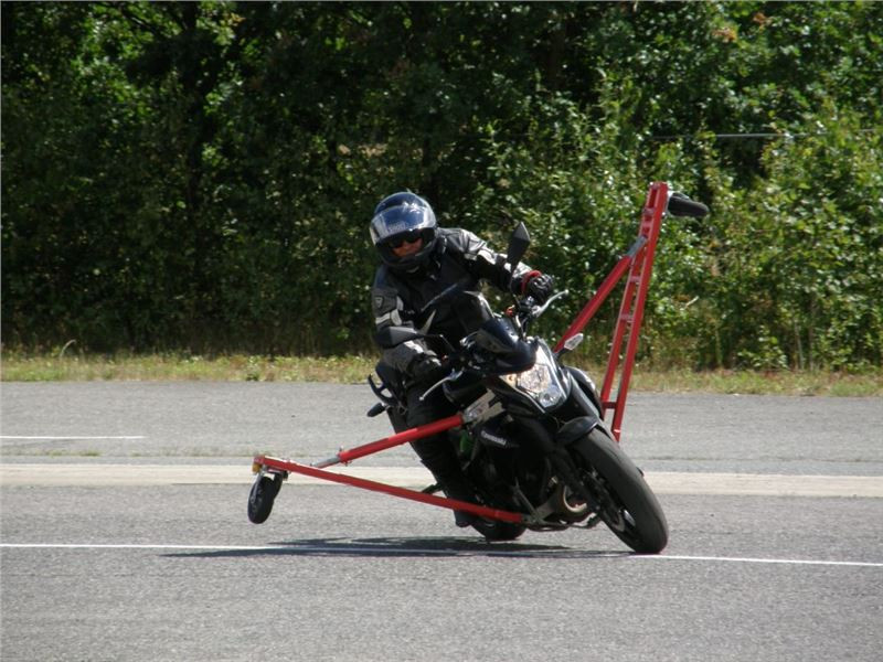 Venku stojí dvě motorky, GS 1200 a Kawasaki ER-6n, obě s namontovanými křidélky. Ono to označení asi není úplně správně, ale sami majitelé školy tyto přídavné konstrukce s opěrnými kolečky takto nazývají, proto se s tím rád ztotožňuji a těším se na první svezení. Tomu však předchází rozprava o základech fyziky, úzce související s jízdou na motorce. Gyroskopické jevy, styčná plocha pneumatik s vozovkou při zrychlování a brzdění, při jízdě rovně a do zatáčky. V jedné mnou neoblíbené pohádce se zpívá: statistika nuda je, má však cenné údaje. Záhy si člověk uvědomí mnoho souvislostí, o kterých ví nebo minimálně už někdy dříve slyšel, ale tak nějak na ně za běžného provozu nemyslí. Car-Pro® Akademie GmbH nenechává nic náhodě a kurzy rozděluje do několika kategorií od náklonu 35° pro začátečníky, až pro pokročilé do 50°. S ohledem na osobní přístup ke každému účastníkovi a dostatek času k výuce je v každé lekci maximálně 6-8 jedinců, podle typu kurzu. Tím si uvědomuji, že v mnou vybraném celodenním kurzu jsem sedmé kolo u Tatry, ale Frank má vše pod kontrolou a časový plán nijak nenaruším. Navíc, pro všechny případy a úplné začátečníky, je v garáži zaparkovaný třetí motocykl, konkrétně BMW 310 GS, takže každý má svou jízdu jistou.