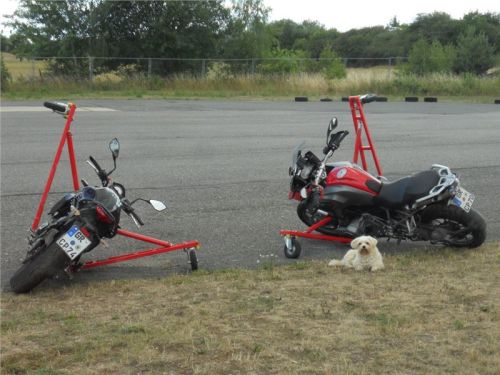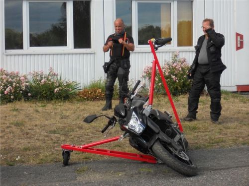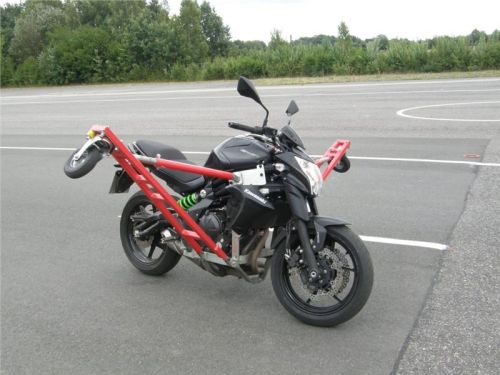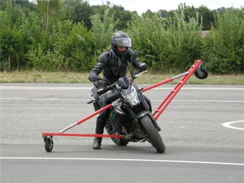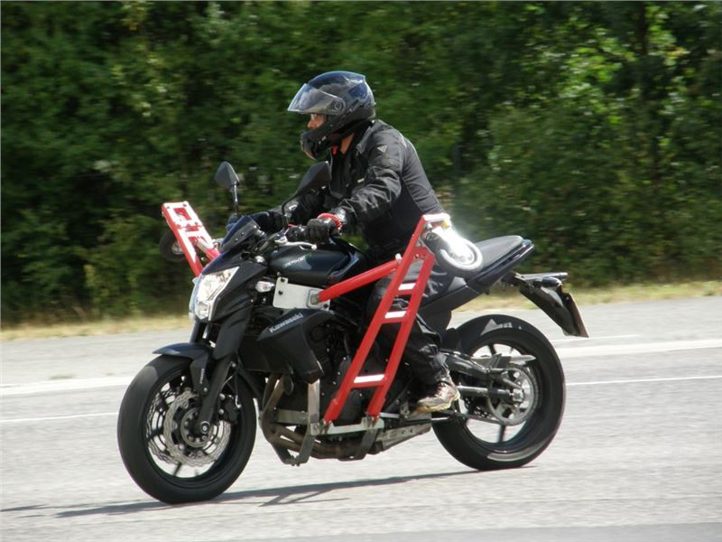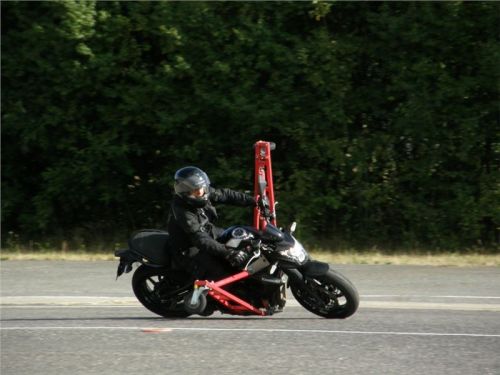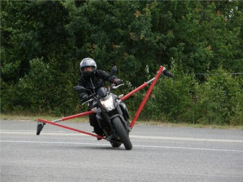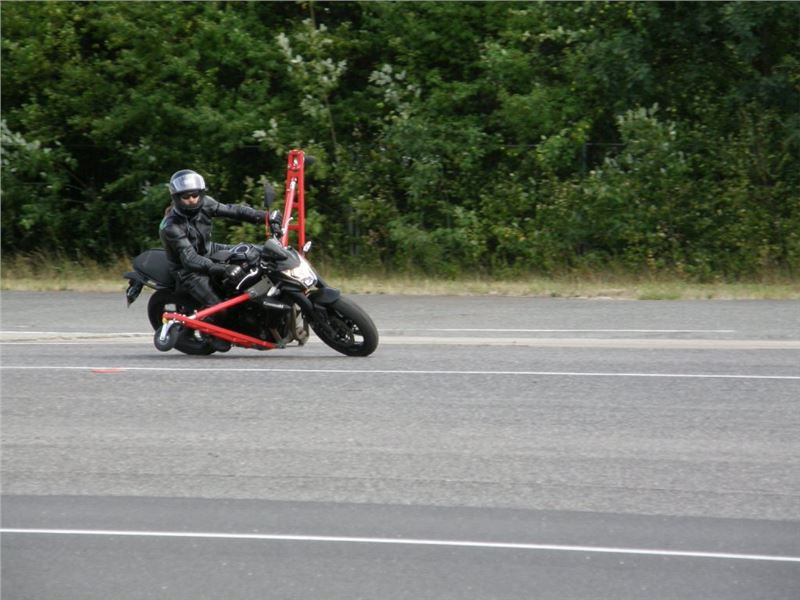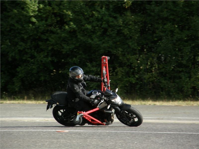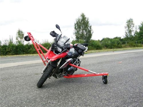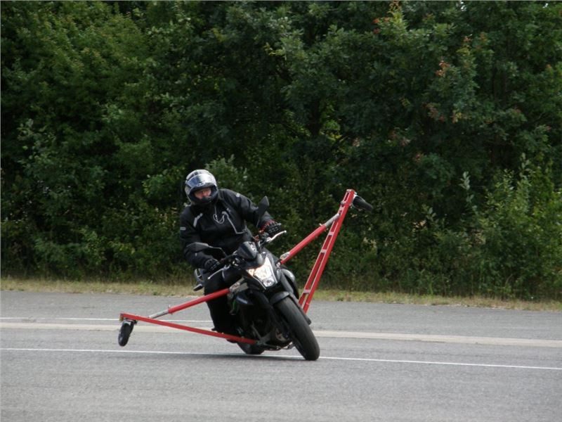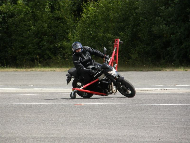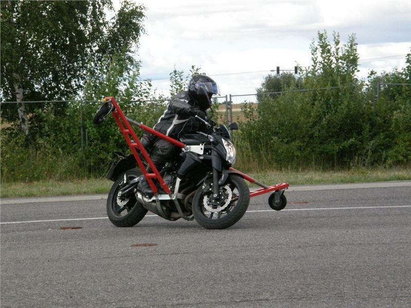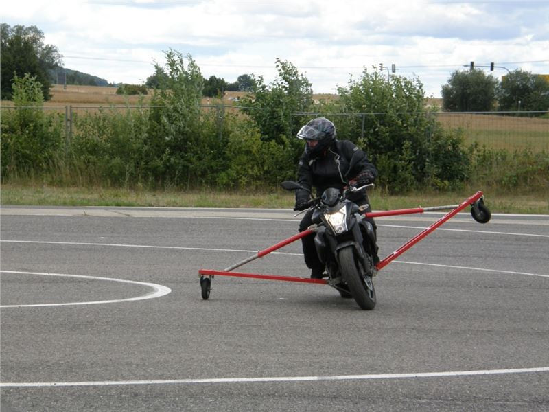 Venku stojí dvě motorky, GS 1200 a Kawasaki ER-6n, obě s namontovanými křidélky. Ono to označení asi není úplně správně, ale sami majitelé školy tyto přídavné konstrukce s opěrnými kolečky takto nazývají, proto se s tím rád ztotožňuji a těším se na první svezení. Tomu však předchází rozprava o základech fyziky, úzce související s jízdou na motorce. Gyroskopické jevy, styčná plocha pneumatik s vozovkou při zrychlování a brzdění, při jízdě rovně a do zatáčky. V jedné mnou neoblíbené pohádce se zpívá: statistika nuda je, má však cenné údaje. Záhy si člověk uvědomí mnoho souvislostí, o kterých ví nebo minimálně už někdy dříve slyšel, ale tak nějak na ně za běžného provozu nemyslí. Car-Pro® Akademie GmbH nenechává nic náhodě a kurzy rozděluje do několika kategorií od náklonu 35° pro začátečníky, až pro pokročilé do 50°. S ohledem na osobní přístup ke každému účastníkovi a dostatek času k výuce je v každé lekci maximálně 6-8 jedinců, podle typu kurzu. Tím si uvědomuji, že v mnou vybraném celodenním kurzu jsem sedmé kolo u Tatry, ale Frank má vše pod kontrolou a časový plán nijak nenaruším. Navíc, pro všechny případy a úplné začátečníky, je v garáži zaparkovaný třetí motocykl, konkrétně BMW 310 GS, takže každý má svou jízdu jistou.