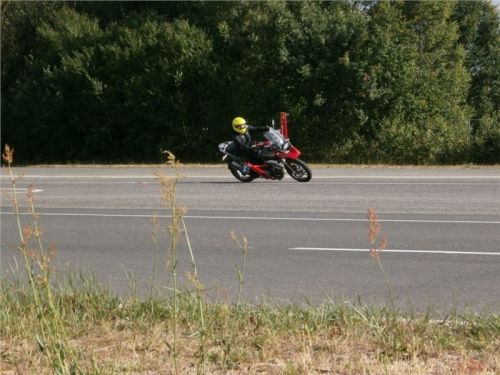 Zkouším polohu na „anglána“, jak tady říkají anglický styl. Vzpřímená poloha bez vyčnívajícího těla, zkouším i vysedat „na kolínko“ dovnitř zatáčky, světově nazývaném „hanging off“ a přestože každému vyhovuje něco jiného, „offroad“ styl se jeví pro ovládání motocyklu jako nejcitlivější. Baví mě to. Všichni máme v kapse vysílačku a v uších sluchátka, aby nám Frank mohl dávat pokyny a rady k momentálnímu stylu jízdy a k chybám, které u nás pozoruje.