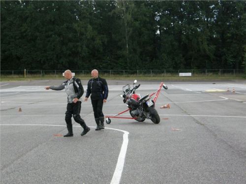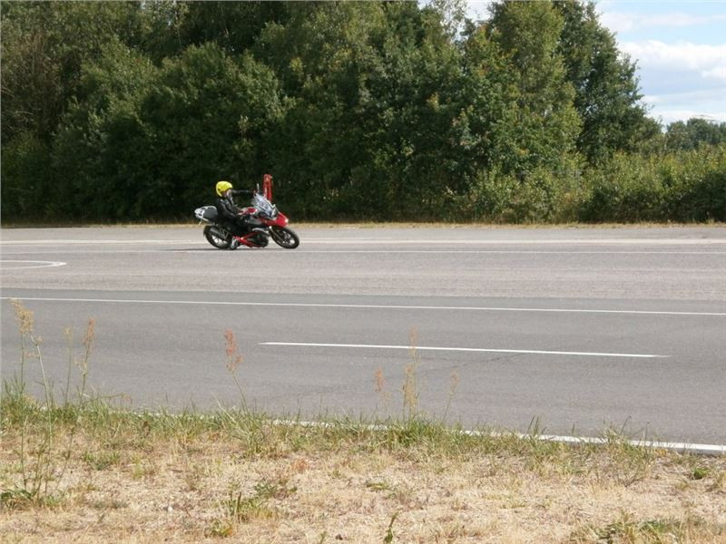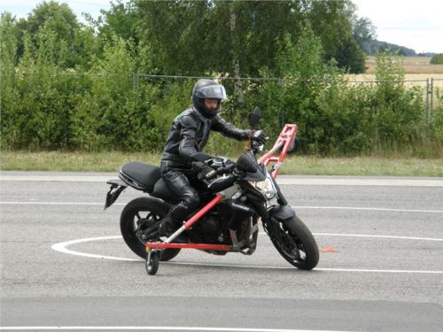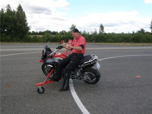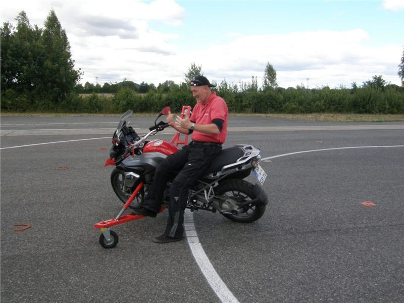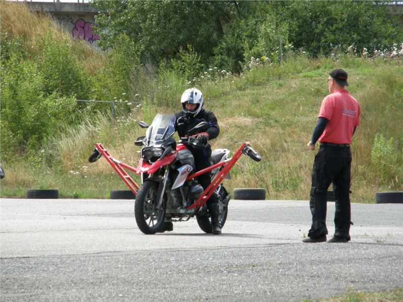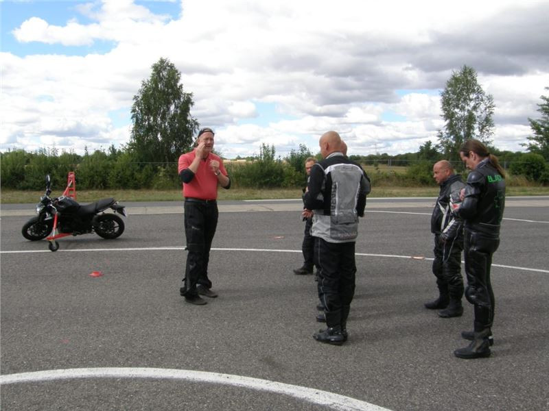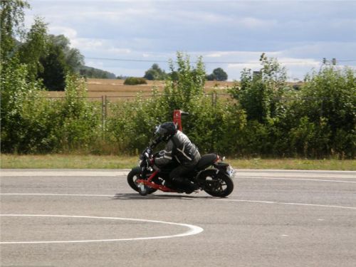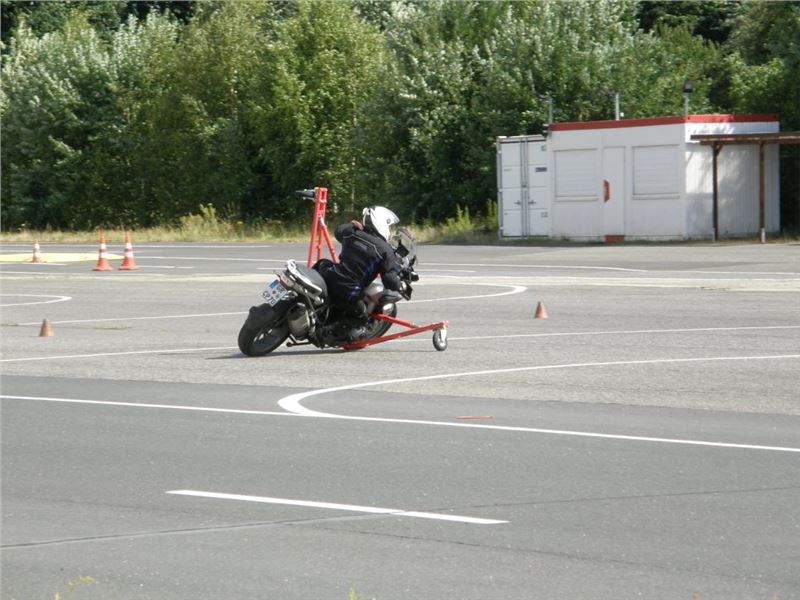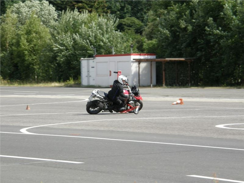 Zácvik probíhá ježděním kopírujíc motorkou namalovaný kruh z jedné a pak z druhé strany. Banální cvičení zvládám jako totální trotl, několikrát vyjedu z vymezeného prostoru, než si uvědomím, co se po mě vlastně žádá a jak to mám udělat. Uklidňuje mě, že nejsem sám. OK, sorry, entschuldigung. Tak ještě jednou a pořádně...