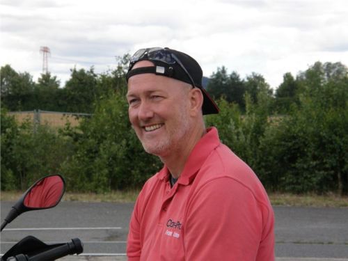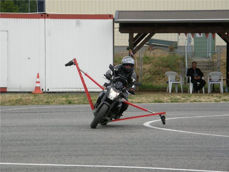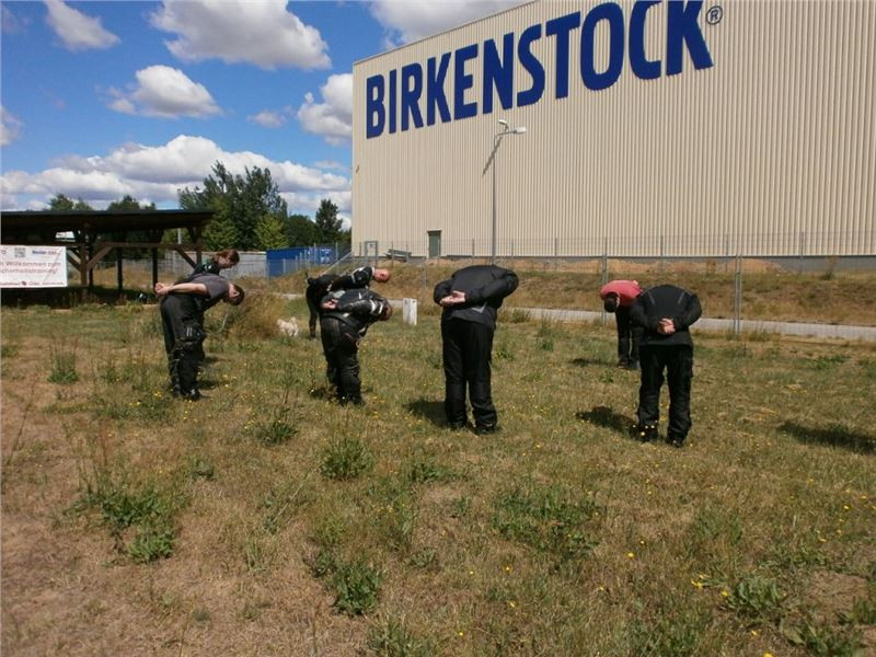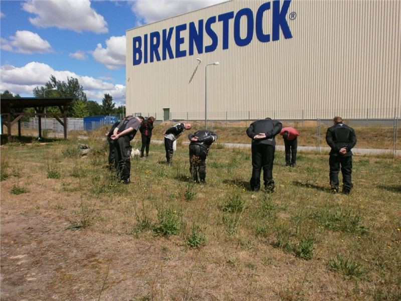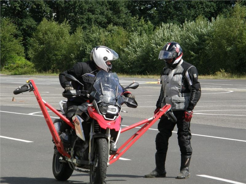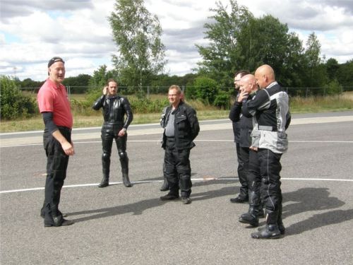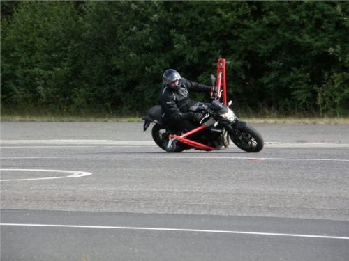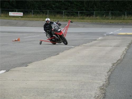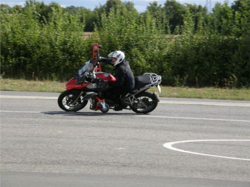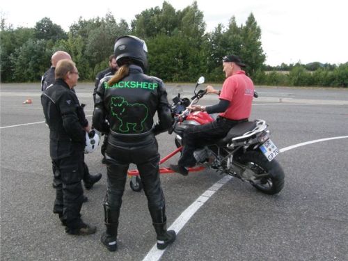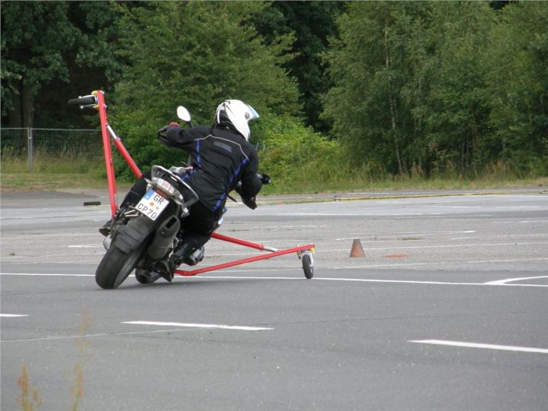 Zácvik probíhá ježděním kopírujíc motorkou namalovaný kruh z jedné a pak z druhé strany. Banální cvičení zvládám jako totální trotl, několikrát vyjedu z vymezeného prostoru, než si uvědomím, co se po mě vlastně žádá a jak to mám udělat. Uklidňuje mě, že nejsem sám. OK, sorry, entschuldigung. Tak ještě jednou a pořádně...