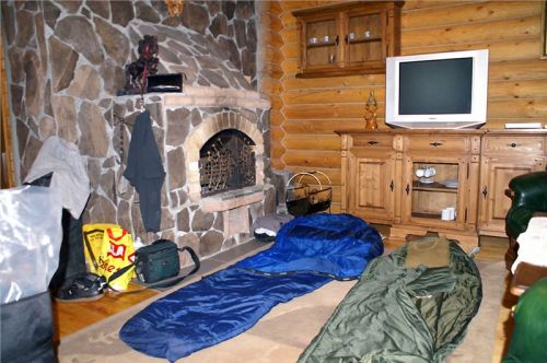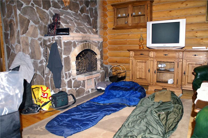 Přemístíme motorky kam třeba, odnosíme těch pár cajků nahoru a obratem ruky učiníme z uhlazeného a luxusního appartementu motorkářské doupě plné zaprášeného a už zvolna zavánějícího bordýlku. Nerozlučná trojka Blšounů s Evou berou ložnici (Jindra asi bude spát na letišti mezi dvěma dámami :-) – ne že bych mu záviděl ...), my svobodní pánové berem pokoj. Ten má na podlaze tak luxusní a hebounký koberec, že rezignujeme na karimámy a plácneme spacáky rovnou na zem.