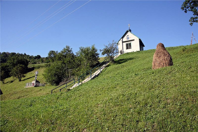 Poprvé nás Jindra zastaví u místního kostelíka s malou kaplí vysoko na svahu nad ním. Kostelík s obydlím popa kontrastuje se zbytkem vesnice, neb jest v perfektním stavu, stejně jako jeho okolí. Z kostelního pítka si načepujeme čerstvou vodu, Jindra dokonce pronikne dovnitř a pohovoří s popem. Já taky nakouknu, nicméně popravdě, pravoslavná přepozlátkovaná vnitřní výzdoba mému spíše protestantskému až kalvinistickému naturelu nekonvenuje. Ale, jiný kraj, jiný mrav.