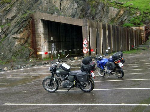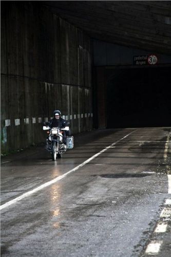 Kolegům přede mnou zdá se mokro nesedí. Asi vprostřed kopce mě napadne, že bych se mohl trhnout vpřed a zkusit u tunelu udělat pár jízdních fotek. Takže předjedu a mažu nahoru, co dá stroj a silnice. Bohužel, nahnat dostatečný náskok se mi nedaří, než bych tasil foťák, byli by všici přede mnou. Tak tedy projedu tunel a setkáme se všichni na severní straně.