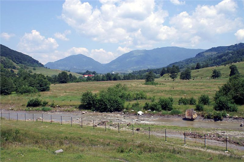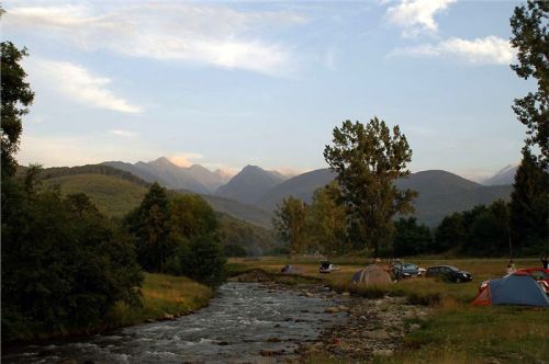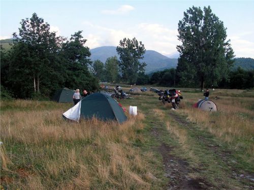 opět dá dohromady, opustíme hory a podél bystřiny míříme do roviny údolí řeky Ort. Kousek před obcí Cârţişoara se po pravé straně mezi silnicí a říčkou objeví louka s pár stany. No, asi budeme stavět, a taky že jo. OK, vypadá to tu slušně, tak se zde na noc zastavíme.